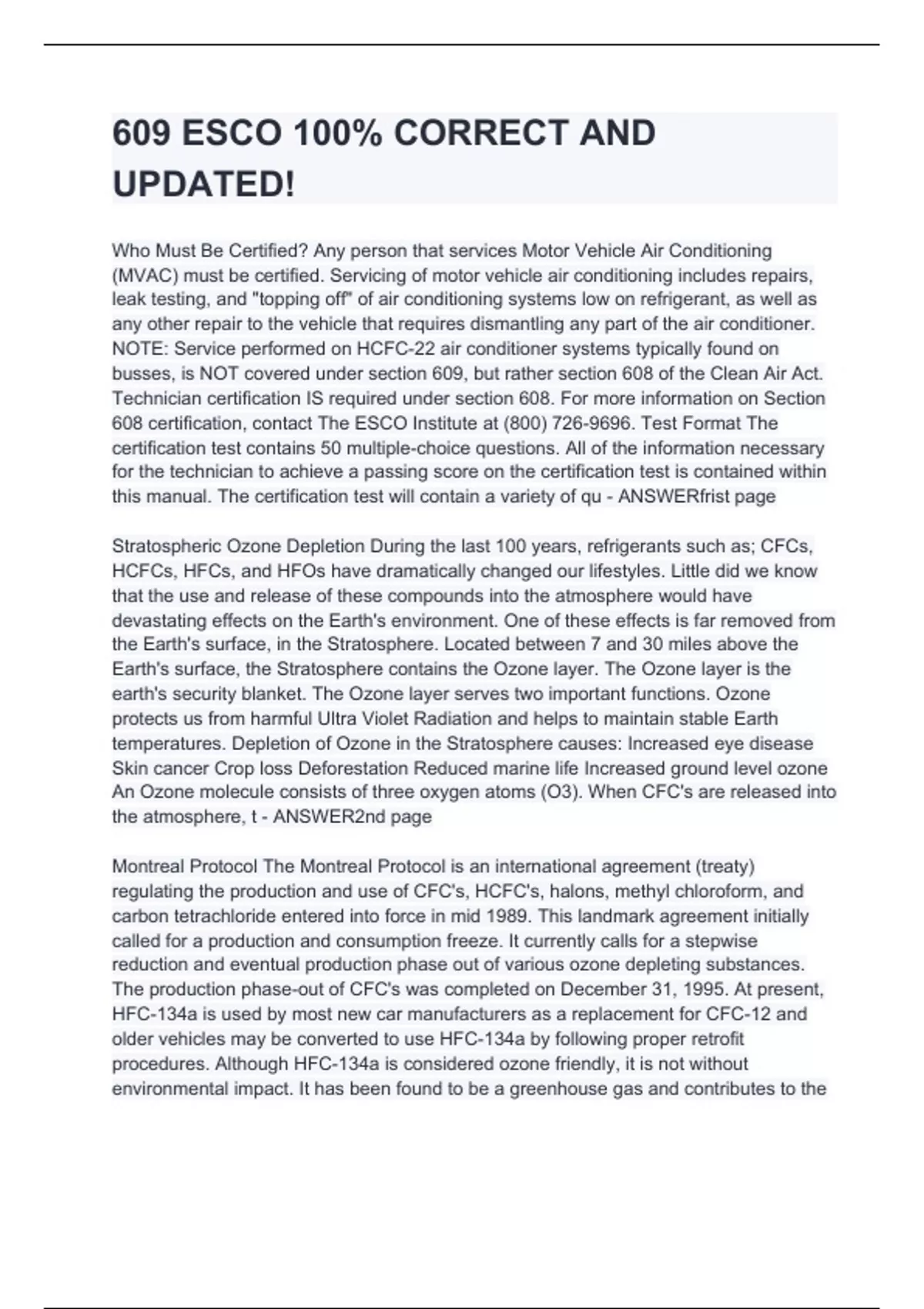 Who Must Be Certified? Any person that services Motor Vehicle Air Conditioning (MVAC) must be certified. Servicing of motor vehicle air conditioning includes repairs, leak testing, and "topping off" of air conditioning systems low on refrigerant, as well as any other repair to the vehicle that requires dismantling any part of the air conditioner. NOTE: Service performed on HCFC-22 air conditioner systems typically found on busses, is NOT covered under section 609, but rather section 608 of the Clean Air Act. Technician certification IS required under section 608. For more information on Section 608 certification, contact The ESCO Institute at (800) 726-9696. Test Format The certification test contains 50 multiple-choice questions. All of the information necessary for the technician to achieve a passing score on the certification test is contained within this manual. The certification test will contain a variety of qu - ANSWERfrist page Stratospheric Ozone Depletion During the last 100 years, refrigerants such as; CFCs, HCFCs, HFCs, and HFOs have dramatically changed our lifestyles. Little did we know that the use and release of these compounds into the atmosphere would have devastating effects on the Earth's environment. One of these effects is far removed from the Earth's surface, in the Stratosphere. Located between 7 and 30 miles above the Earth's surface, the Stratosphere contains the Ozone layer. The Ozone layer is the earth's security blanket. The Ozone layer serves two important functions. Ozone protects us from harmful Ultra Violet Radiation and helps to maintain stable Earth temperatures. Depletion of Ozone in the Stratosphere causes: Increased eye disease Skin cancer Crop loss Deforestation Reduced marine life Increased ground level ozone An Ozone molecule consists of three oxygen atoms (O3). When CFC's are released into the atmosphere, t - ANSWER2nd page