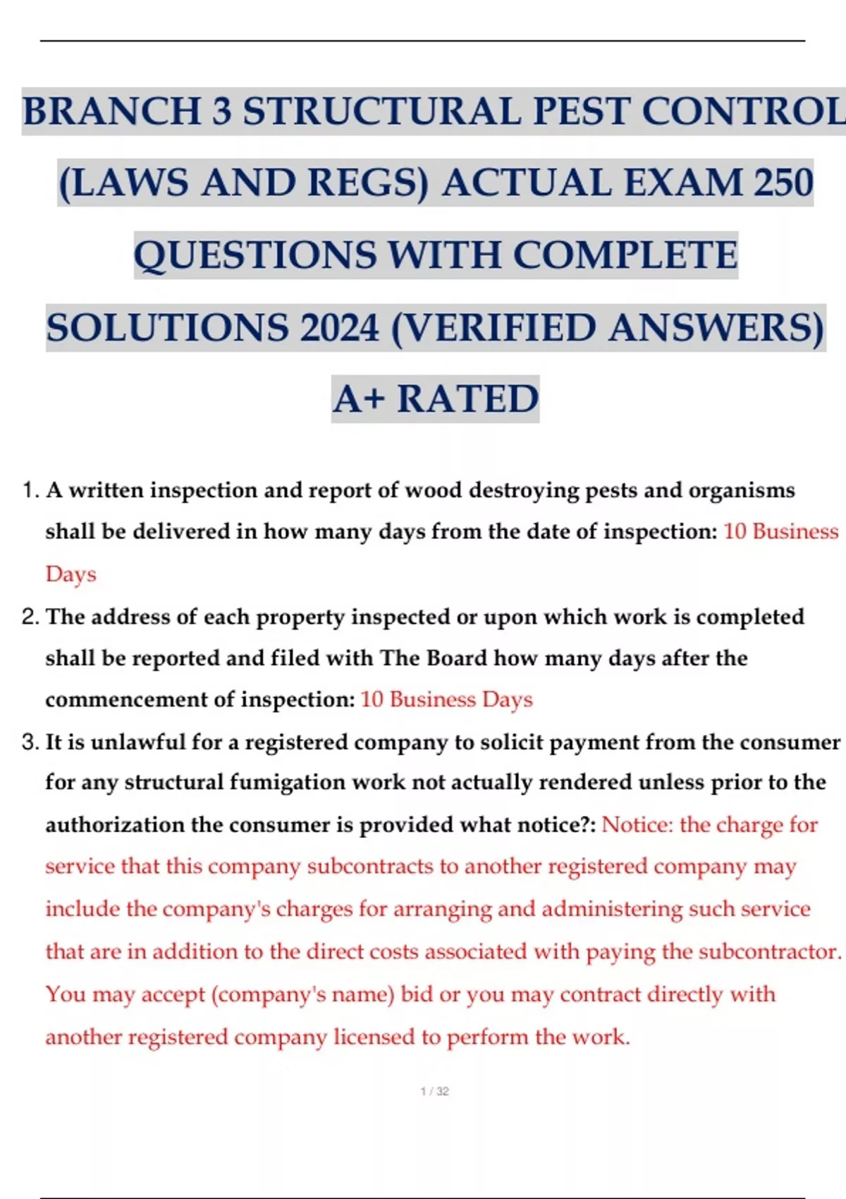 BRANCH 3 STRUCTURAL PEST CONTROL (LAWS AND REGS) ACTUAL EXAM 250 QUESTIONS WITH COMPLETE SOLUTIONS 2024 (VERIFIED ANSWERS) A+ RATED