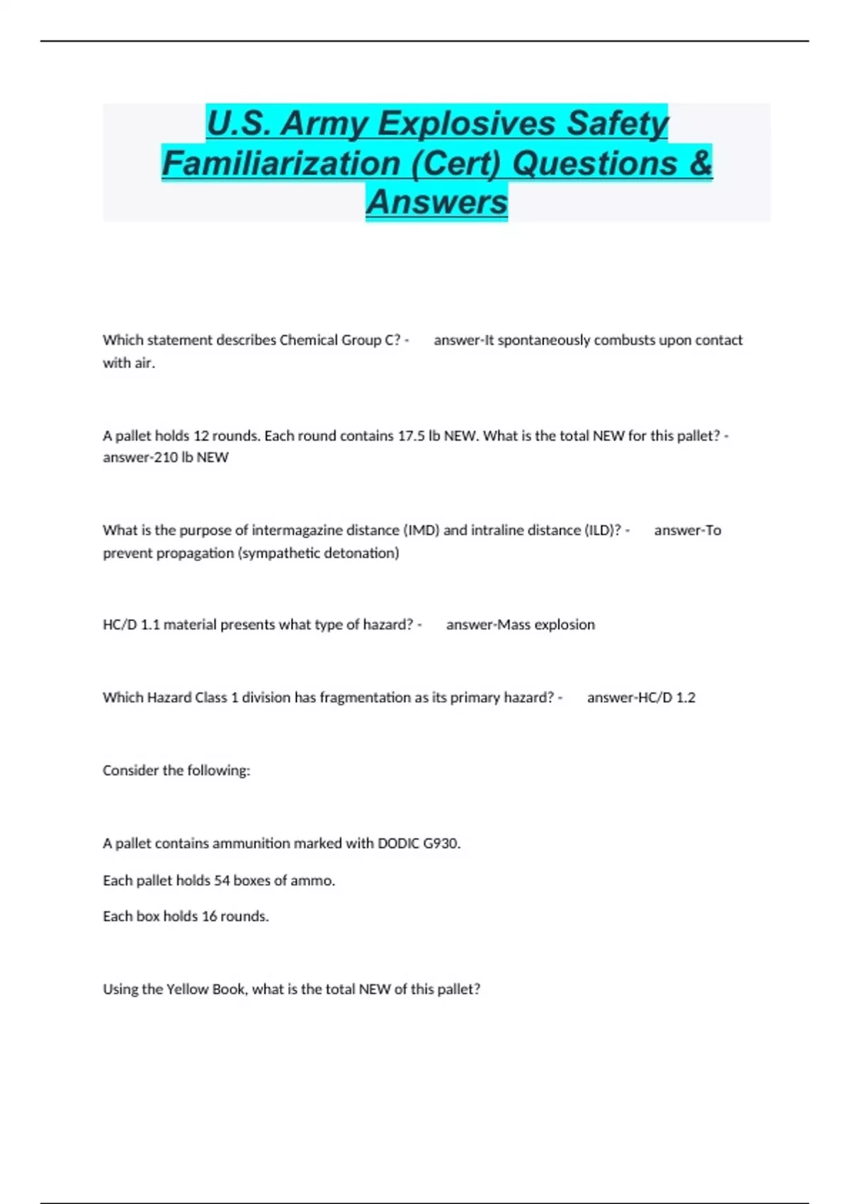 U.S. Army Explosives Safety Familiarization (Cert) Questions & Answers