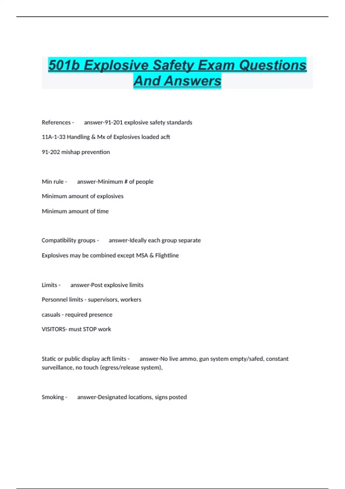 References - answer-91-201 explosive safety standards 11A-1-33 Handling & Mx of Explosives loaded acft 91-202 mishap prevention Min rule - answer-Minimum # of people Minimum amount of explosives Minimum amount of time Compatibility groups - answer-Ideally each group separate Explosives may be combined except MSA & Flightline Limits - answer-Post explosive limits Personnel limits - supervisors, workers casuals - required presence VISITORS- must STOP work Static or public display acft limits - answer-No live ammo, gun system empty/safed, constant surveillance, no touch (egress/release system), Smoking - answer-Designated locations, signs posted