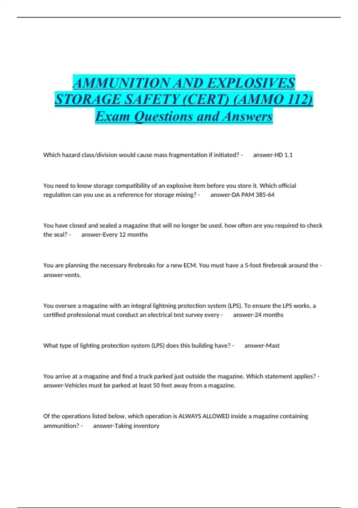 AMMUNITION AND EXPLOSIVES STORAGE SAFETY (CERT) (AMMO 112) Exam Questions and Answers
