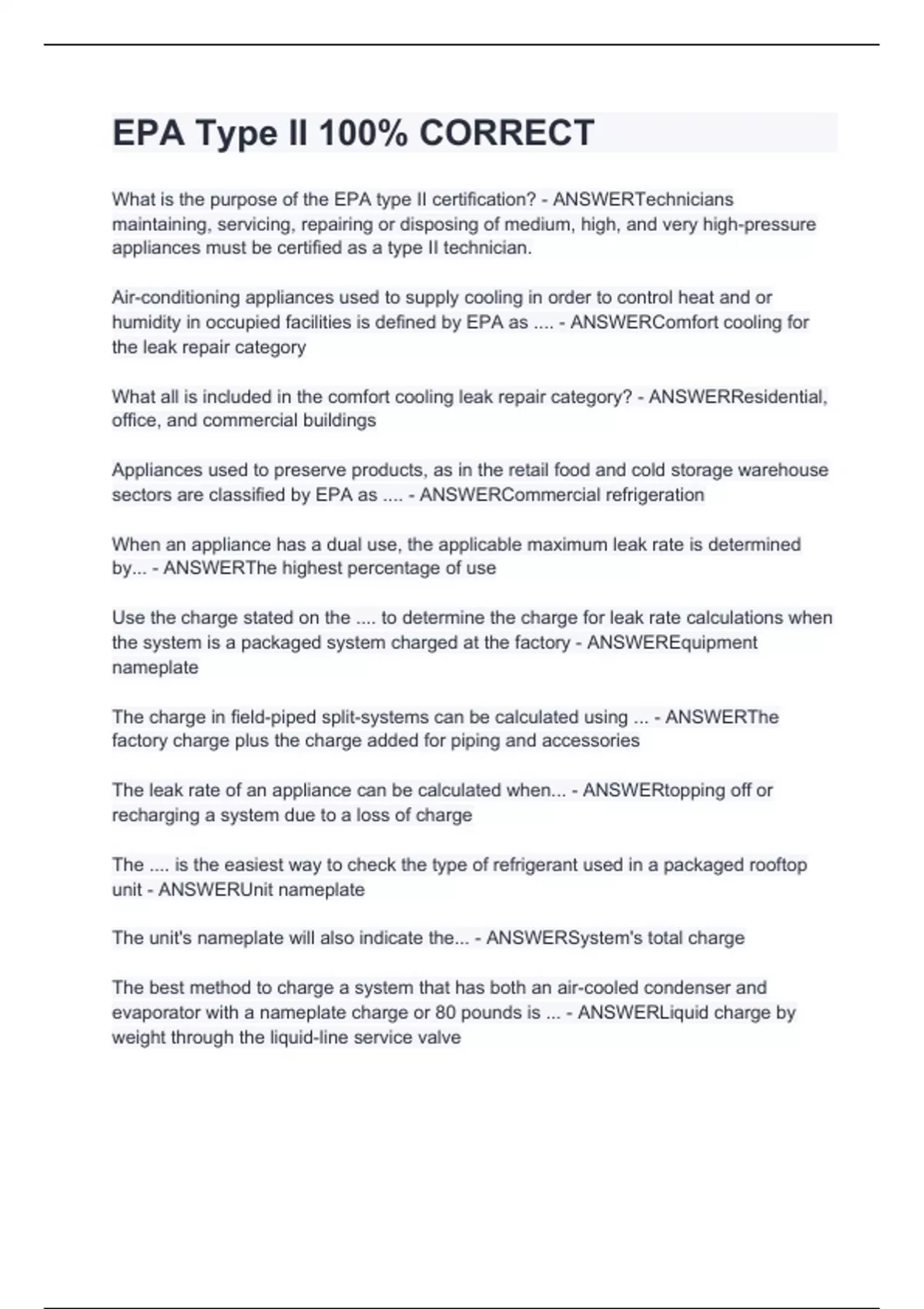 What is the purpose of the EPA type II certification? - ANSWERTechnicians maintaining, servicing, repairing or disposing of medium, high, and very high-pressure appliances must be certified as a type II technician. Air-conditioning appliances used to supply cooling in order to control heat and or humidity in occupied facilities is defined by EPA as .... - ANSWERComfort cooling for the leak repair category What all is included in the comfort cooling leak repair category? - ANSWERResidential, office, and commercial buildings Appliances used to preserve products, as in the retail food and cold storage warehouse sectors are classified by EPA as .... - ANSWERCommercial refrigeration When an appliance has a dual use, the applicable maximum leak rate is determined by... - ANSWERThe highest percentage of use Use the charge stated on the .... to determine the charge for leak rate calculations when the system is a packaged system charged