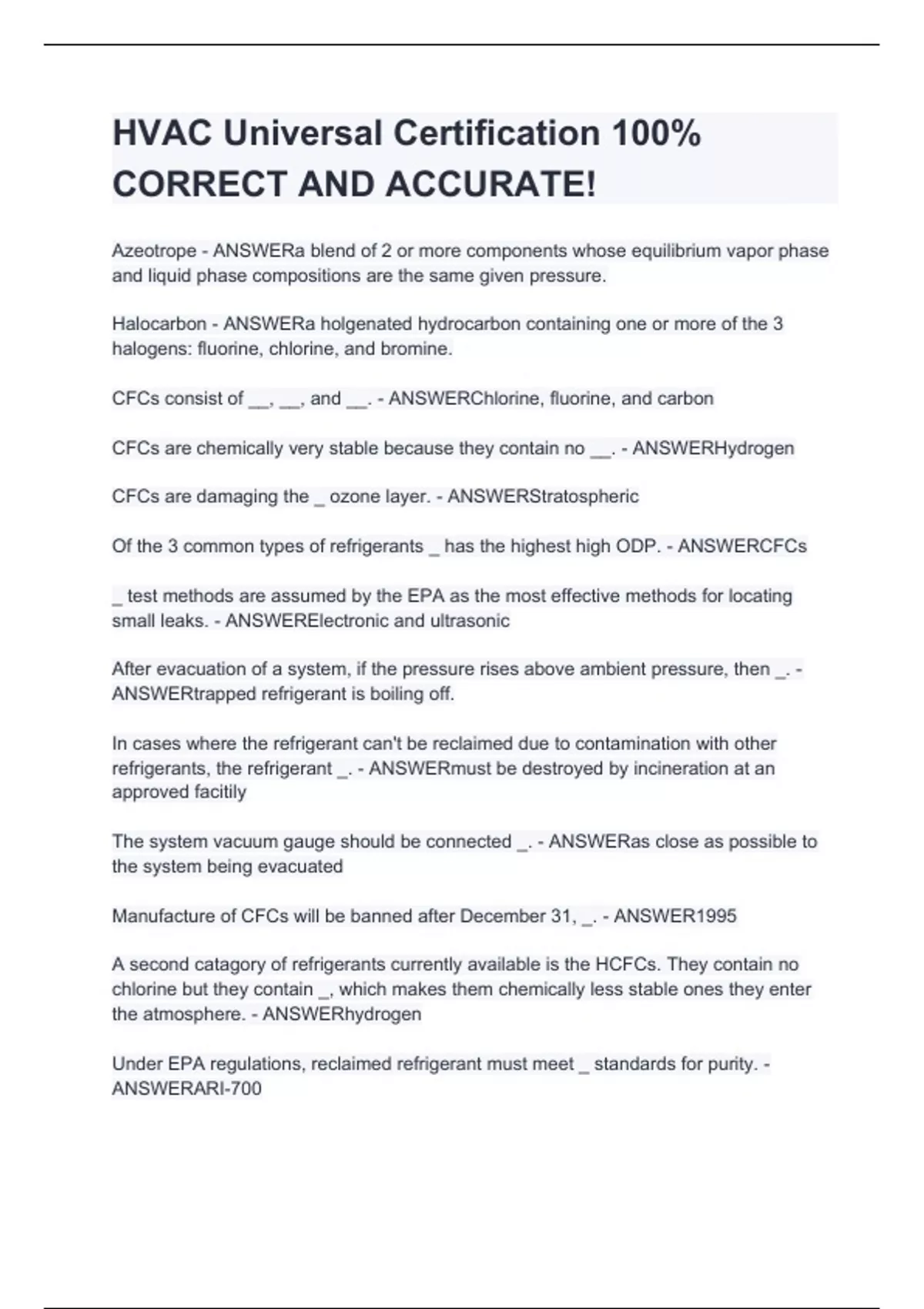 HVAC Universal Certification 100% CORRECT AND ACCURATE!