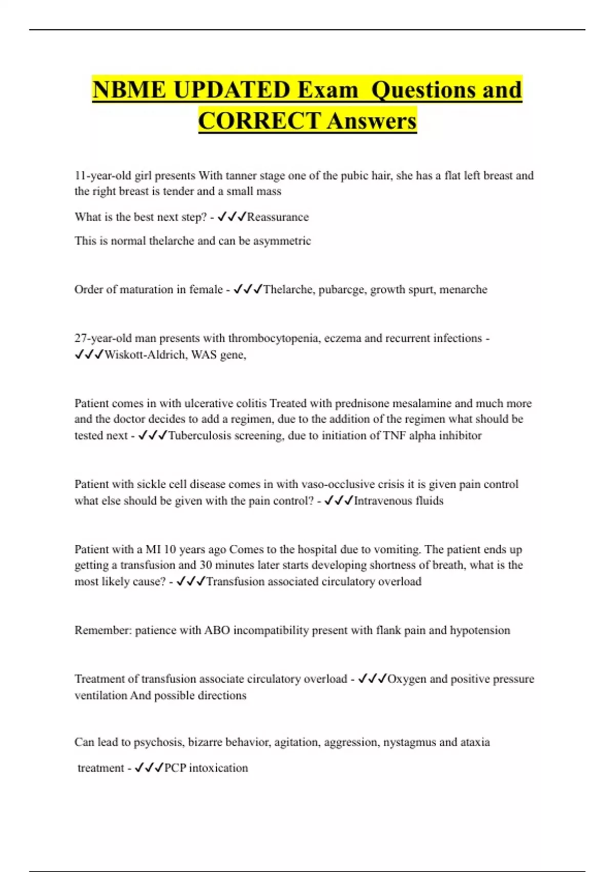 11-year-old girl presents With tanner stage one of the pubic hair, she has a flat left breast and the right breast is tender and a small mass What is the best next step? - Reassurance This is normal thelarche and can be asymmetric Order of maturation in female - Thelarche, pubarcge, growth spurt, menarche 27-year-old man presents with thrombocytopenia, eczema and recurrent infections - Wiskott-Aldrich, WAS gene, Patient comes in with ulcerative colitis Treated with prednisone mesalamine and much more and the doctor decides to add a regimen, due to the addition of the regimen what should be tested next - Tuberculosis screening, due to initiation of TNF alpha inhibitor Patient with sickle cell disease comes in with vaso-occlusive crisis it is given pain control what else should be given with the pain control? - Intravenous fluids