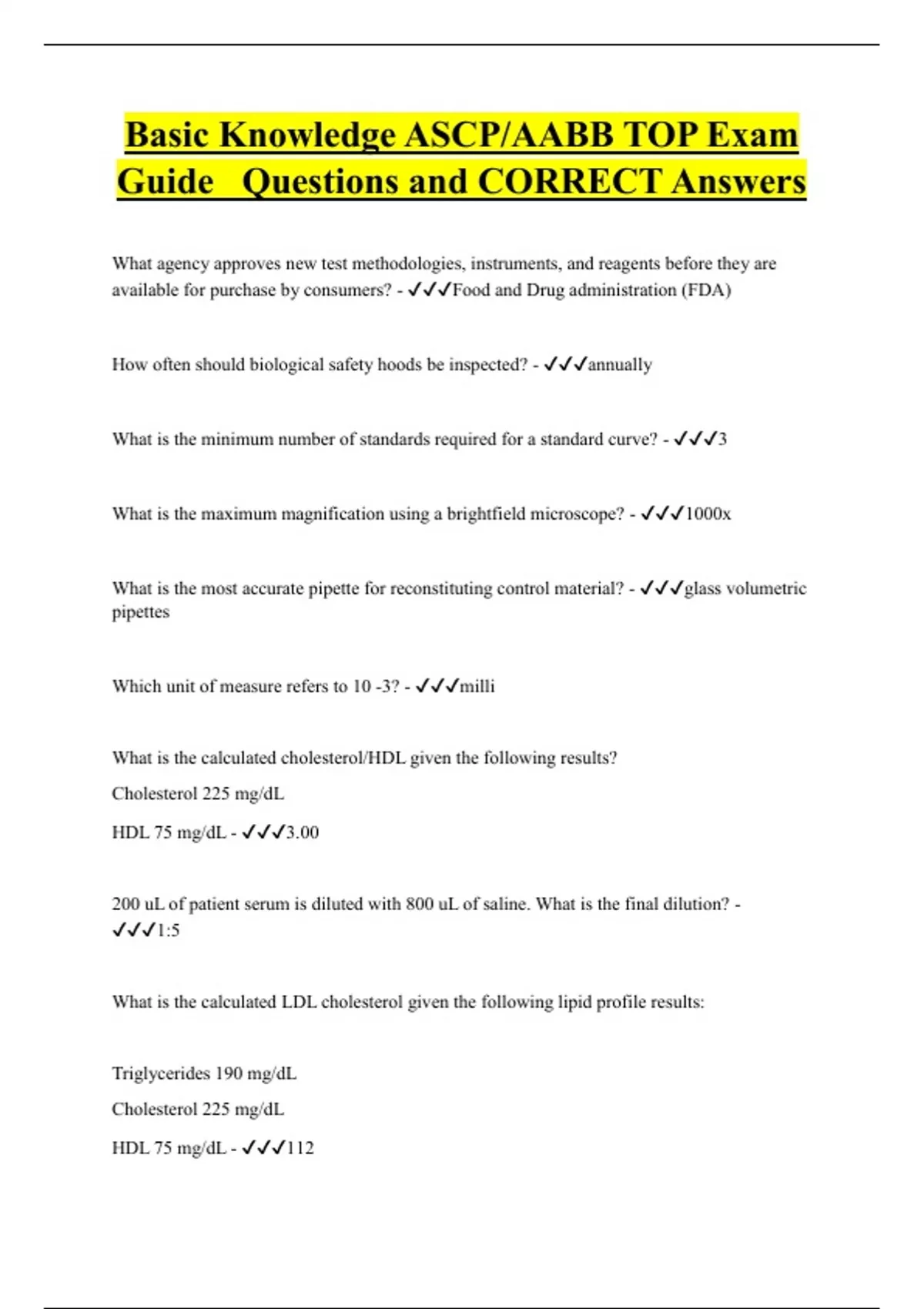 What agency approves new test methodologies, instruments, and reagents before they are available for purchase by consumers? - Food and Drug administration (FDA) How often should biological safety hoods be inspected? - annually What is the minimum number of standards required for a standard curve? - 3 What is the maximum magnification using a brightfield microscope? - 1000x What is the most accurate pipette for reconstituting control material? - glass volumetric pipettes Which unit of measure refers to 10 -3? - milli What is the calculated cholesterol/HDL given the following results?