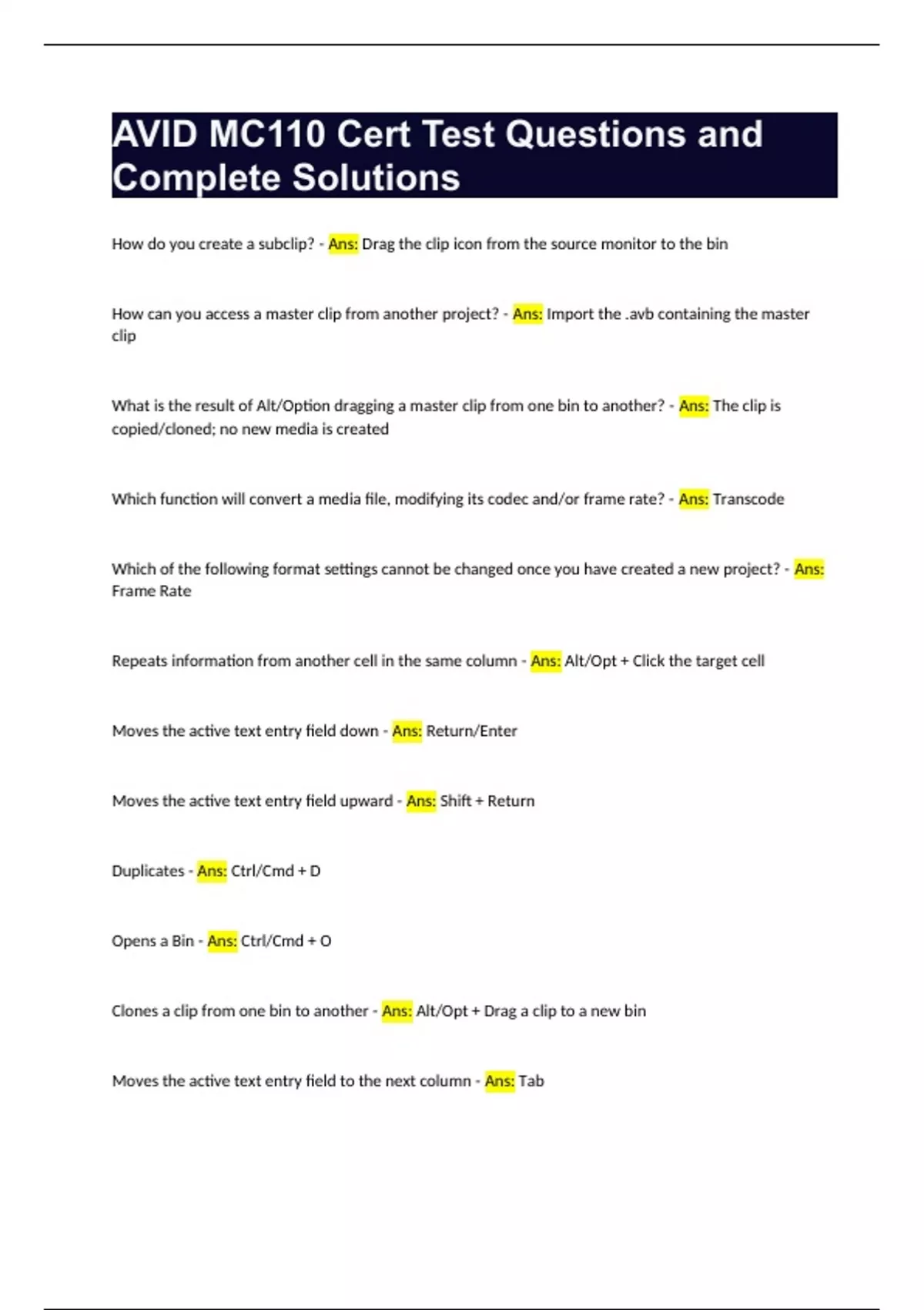 AVID MC110 Cert Test Questions and Complete Solutions How do you create a subclip? - Ans: Drag the clip icon from the source monitor to the bin How can you access a master clip from another project? - Ans: Import the .avb containing the master clip What is the result of Alt/Option dragging a master clip from one bin to another? - Ans: The clip is copied/cloned; no new media is created Which function will convert a media file, modifying its codec and/or frame rate? - Ans: Transcode Which of the following format settings cannot be changed once you have created a new project? - Ans: Frame Rate Repeats information from another cell in the same column - Ans: Alt/Opt + Click the target cell Moves the active text entry field down - Ans: Return/Enter Moves the active text entry field upward - Ans: Shift + Return Duplicates - Ans: Ctrl/Cmd + D Opens a Bin - Ans: Ctrl/Cmd + O Clones a clip from one bin to another - Ans: Alt/Opt + Drag a clip to a new bin Moves the active text entry field to the next column - Ans: Tab Groups clips - Ans: Ctrl/Cmd + Shift + G Changes a custom column heading - Ans: Alt/Opt + Click the column heading Moves the active text entry field to the column on the left - Ans: Shift + Tab You want to Import at DNXHD 60 but this is not available in the Source browser. How do you access this resolution? - Ans: Change the project format Which setting will resize a large photograph during import to avoid distorting it? - Ans: Resize Image to Fit Format Raster Cloned master clips will reflect any changes made (ex: adding in/out points) across all bins in which that clip is located. - Ans: True Which icon represents a subclip? - Ans: D, the small one frame film strip Which function will copy a media file without recompressing it? - Ans: Consolidate From which menu do you open the Source Browser? - Ans: File > Input Tools You have audio and video master clips that do not have a common timecode reference or a clapper board but have audio on both. Is it possible to sync these clips? - Ans: Yes Where do bins opened from other projects appear? - Ans: In the Other Bins folder If an effect, such as the Mask, is applied to an empty track of filler above the sequence, what is the result? - Ans: The Mask will be applied to the entire sequence. Any adjustment to the Mask will be consisten for the full sequence. Where is the Avid MediaFiles folder located? - Ans: At the root level of the hard drive How can you load a sequence into the Source Monitor? - Ans: Drag the sequence from the bin into the Source Monitor How do you clear all marks from a clip or a group of clips? - Ans: Select all clips in the bin and press the "G" key Which function loads the source clip for a segment in the sequence to the Source Monitor? - Ans: Match Frame You can use the In and Out shortcuts to trim on the fly in Trim Mode - Ans: True Length of the entire clip or sequence - Ans: Duration (D) Time from the head of clip or sequence (00:00) to the position indicator - Ans: Absolute (Ab) Time remaining from the position indicator to the end of the clip or sequence - Ans: Remain (R) Location of the position indicator on the sequence's Timecode track - Ans: Master (M) Marked region of the clip or sequence - Ans: In/Out (IO) What value would you type to advance the position indicator 2 seconds? - Ans: 200 Which button can be used to remove the head of a shot in the timeline? - Ans: Film strip, white on left black on right In which effects category is the Timecode Burn-in effect located? - Ans: Generator Extend is similar to which type of Trim? - Ans: Dual Edit Roller Media composer will not allow you to make an edit with no marks. - Ans: False The timeline is configured for which type of trim? - Ans: Slip Which type of edit is most similar to the Top and Tail functions? - Ans: Extract If you hear an unwanted sound in the audio at an edit point, but can't tell which side contains the problem, what can you do to find out? - Ans: Press Q to play the outgoing side of the transition only Press W to play the incoming side of the transition only What order does Media Composer use when you perform a storyboard edit from the bin? - Ans: Left to right in rows, highest to lowest Which type of edit is most similar to Top or Tail - Ans: Extract If editing a group of clips to the sequence from the bin in Text view, what controls the order in which the clips will appear in the sequence? - Ans: The order in which they're sorted from top to bottom in the bin Which option will display the timecode of the position indicator as defined on the timecode track of the sequence? - Ans: Master What is the difference between "Find" and "Find Bin" - Ans: "Find" tool searches across all metadata in the project while "Find Bin" finds the original vin in which a clip is stored Which of the following describes the Audio EQ tool? - Ans: A three-band EQ Timewarp effects are generated from a source clip - Ans: False What is the shortcut for adding a keyframe with your keyboard? - Ans: ' (Apostrophe) What is the Master Fader used for? - Ans: To adjust the audio output level of the sequence What does the Audio Ducking tool do automatically? - Ans: Reduces the volume of the music below a certain level whenever dialogue or narration is present What is the purpose of making Audio EQ adjustments? - Ans: To change the balance of low-range and high-range frequencies within a sound Using FrameFlex is a one-time option. After you apply the reframing, a file is created, and you can no longer reframe the native high-resolution clip. - Ans: False What are the three types of retiming effects in Media Composer? - Ans: Freeze Frames, Motion Effects, and Timewarp Creates am ease-in/ease-out movement - Ans: Spline Creates a natural ease-in/ease-out, but with handles that allow for adjustments - Ans: Bezier Holds a keyframe's value until the next keyframe - Ans: Shelf Creates a direct path with a constant speed - Ans: Linear From where do you open the Audio EQ window - Ans: Tool