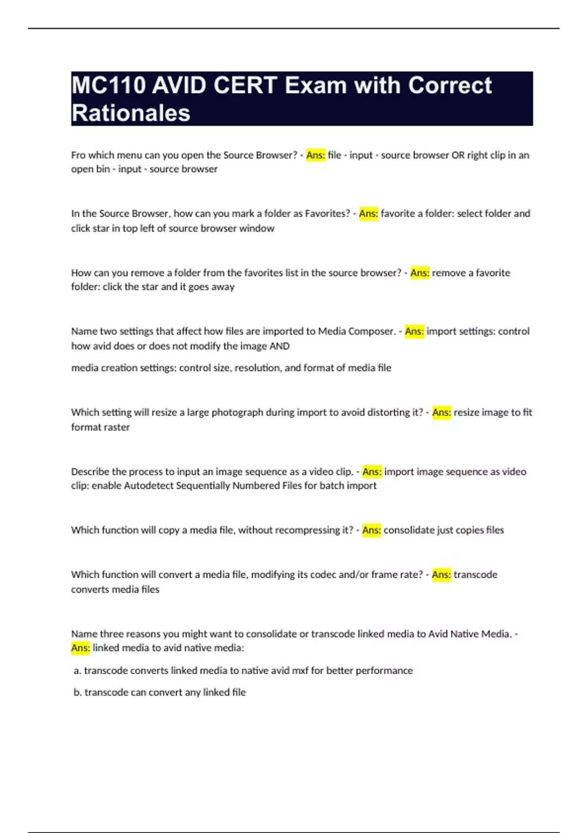 AVID Media Composer 110 Test Questions and Complete Solutions What happens when I clone a sequence from one bin to another? - Ans: Changes made to the clone are made to the original sequence What function divides portions of a master clip into shorter clips? - Ans: Subclip What does the consolidate function do? - Ans: Copies media files without re-encoding the media. What does the transcode function do? - Ans: Converts the media What is considered an AVID codec? - Ans: DNxHD 36 What are the methods that can be used to sync clips? - Ans: In and Out Points, Waveform Analysis, Source Timecode, Auxiliary Timecode What happens when I enable the Media Folder View button? - Ans: I can view my camera files as thumbnails rather than a collection of individual files. True or False: When creating a new project, raster dimensions in Media Composer are limited to the options listed in the Format drop-down menu. - Ans: False What are camera natives? - Ans: The original audio and video files created by the camera that are played back in real time using AMA plugins. What is the fastest way to apply a Timecode Burn-In to a stringent sequence? - Ans: Add the timecode burn-in effect to the filler track above the sequence. True or False: Using Top or Tail to remove footage from the timeline leaves a gap. - Ans: False What are the common uses for markers? - Ans: - Provide correct spelling for titles - Marking the location of good sound bites - Leaving notes for the producer, colorist, or audio mixer Which method should I use in the Command Palette if I want to use it as an editing tool? - Ans: Active Palette What happens if I don't use marks in my timeline? - Ans: The blue position indicator will serve as my in point in the timeline. True or False: Media Composer allows you to load a sequence into the Source monitor. - Ans: True How do I create a new sequence using selected segments in my current space? - Ans: Right click in the timeline and choose "create sequence based on selection" What is a radio edit? - Ans: Turn off video, listen to audio as if it were for radio. How do you trim "on the fly"? - Ans: Use the J K L keys in trim mode How far back will the "M" trim key trim when the frame rate of your project is 24 fps? - Ans: 8 While in trim mode, I would like to add 4 frames to the B side of my edit. How can I accomplish this? - Ans: Type +4 True or False: Slipping changes the position of a shot in your sequence. - Ans: False AVID allows you to raise or lower the bass, midrange, and treble frequencies of an audio clip using what? - Ans: The Audio Equalizer Tool Volume animation in Media Composer utilizes what to ramp volume up or down within a segment? - Ans: Keyframes What are redundant keyframes? - Ans: Keyframes on parameters where no change is taking place What are the 4 different keyframe interpolations? - Ans: Spline, Shelf, Linear, Bezier What does the red bar in the timeline mean? - Ans: Frames are dropped because the system you are working on is being overworked What does the yellow bar in the timeline mean? - Ans: The system you are working on is being overworked but frames are not dropped What does the blue bar in the timeline mean? - Ans: Frames are dropped because the drive you are using is being overworked What do slip edits do? - Ans: Changes the contents of the clip without changing the length or position What does sliding do? - Ans: Changes the position of the clip without changing the length What is pre-roll? - Ans: How much of a clip I see before sliding What is post-roll? - Ans: How much of a clip I see after sliding True or False: Freeze frames are created and modified in the timeline. - Ans: False I need to replace a segment in my timeline, but my new segment is shorter than the one I'm replacing. Which effect(s) can I use to solve this problem? - Ans: - Fit to Fill - Trim to Fill What are the reasons a timeworn effect might need to be rendered to be viewed in realtime? - Ans: - If bezier keyframes are used - If motion is reversed - If the play rate exceeds 1400% - If the render type is set to FluidMotion What category of the effects palette has blur, paint, and scratch removal? - Ans: Image When tracking an object, logo, or person you want to blur out, where is the best place to position the reference pattern (the inner rectangle) in the image so you can get the best motion tracking? - Ans: In a high contrast region True or False: Cropping out the unwanted parts of my image is an example of using a garbage matte. - Ans: True I have applied the Spectrematte but I can still see the green screen and parts of the frame that I don't want removed have become transparent. What should I do? - Ans: Use the eyedropper to select sample background color How do you access the source settings dialogue box? - Ans: - Right click on a clip in the bin - Clip > Source Settings What does "PIP" stand for? - Ans: Picture in Picture How do you mute a video track? - Ans: Right click on the track and select "Mute Clips" True or False: You can replace a shot in PIP effect by stepping into the nest. - Ans: True How is PIP different from the Resize effect? - Ans: It allows you to make an image smaller and see the other images layered underneath. How can I add a pan and zoom effect to a segment in the timeline using FrameFlex so that I don't sacrifice picture quality? - Ans: Select the segment and open the effects editor Expert render selects segments at the location of the position indicator or between in and out points using which rules? - Ans: - Render any effects not completely covered by any other effect - Render any non-real time effects - If and when the video is stacked vertically and will composite together How do you create a watermark on a review copy? - Ans: Using a segment or filler with the Timecode Burn-In, enable the notes track and type in the text of your watermark. What tool can I use to create tone media for adding bars and tone to my sequence? - Ans: The Audio Tool Video mixdowns are usefu