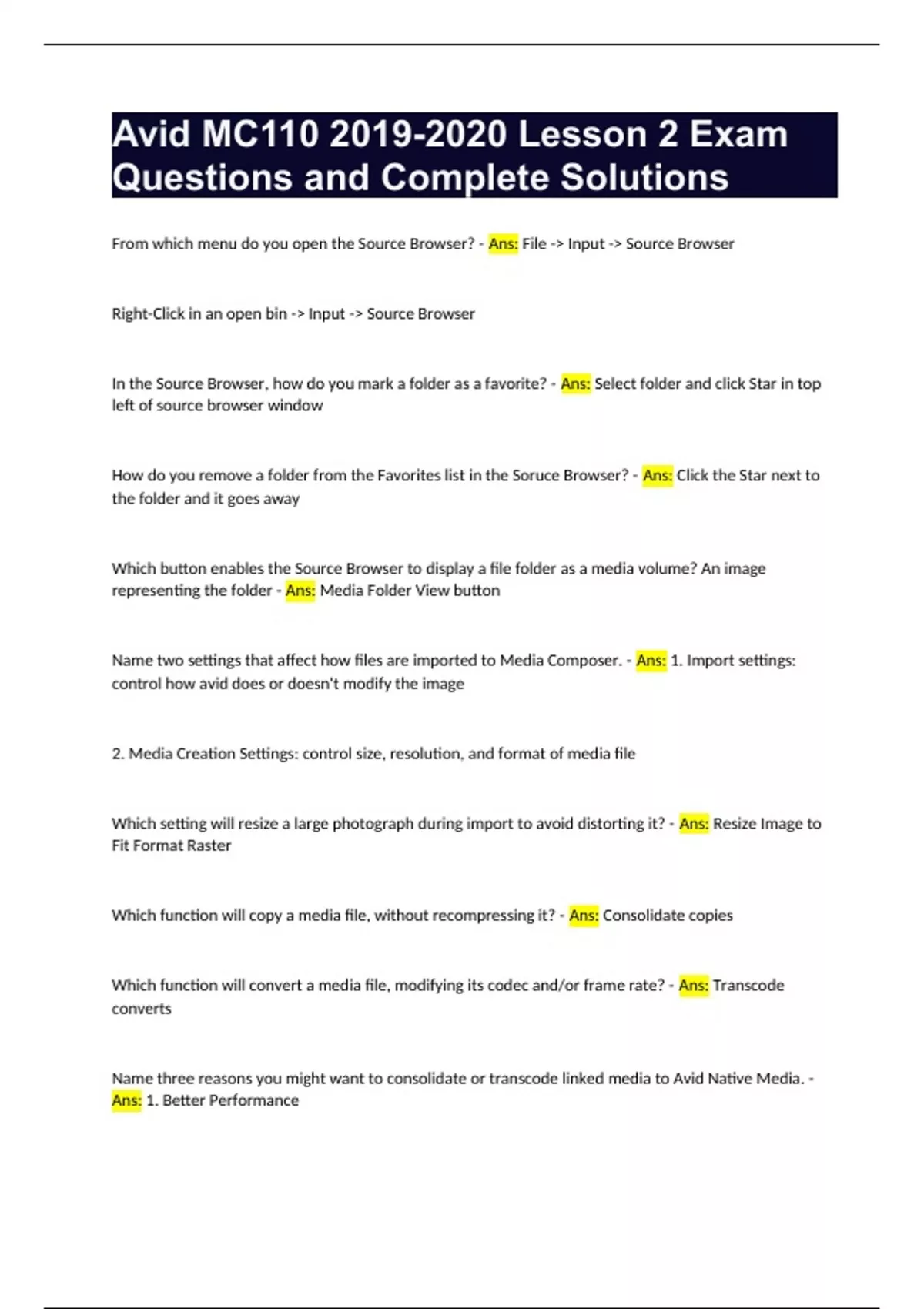 Avid Media Composer – 110 Exam Questions and Complete Solutions Media Composer allows you to create a project with a custom raster dimension. - Ans: True DNxHD and DNxHR are... - Ans: Avid codecs When you consolidate subclips or sequences, new master clips are created with a new duration, based on that of the subclip or segment in the sequence. - Ans: True When transcoding, the drive whose name is bold is the drive that... - Ans: Has the most available space. Avid Native Media is... - Ans: Media created when you Import, Consolidate and Transcode. The Bin View menu will... - Ans: Select a preset or custom view of prearranged bin columns. You can print whatever is displayed in a bin. - Ans: True Creating Subclips... - Ans: Is a great way to manage footage, does not create new media, Can be organized independently of the master clips. Media Composer can open only bins from other projects, not sequences. - Ans: False Select all the ways to sync a Group Clip. - Ans: In Points, Out Points, Source Timecode, and Waveform Analysis. If editing a group of clips to a sequence from the bin in Text view; what controls the order the clips will appear in the sequence? - Ans: You can control the order the clips appear in the sequence simply by sorting them in the bin. If editing a group of clips to the sequence from the bin in Frame view; what controls the order the clip will appear in the sequence? - Ans: Media Composer splices them into the sequence in the order they were arranged in the bin, left to right, top to bottom. Which function is related to Top or Tail? - Ans: Extract How is Extend similar to Trim? What type of Trim? - Ans: Extend is a function that allows you to roll edit points without going into Trim mode. The result of using Extend is identical to doing a dual-roller trim. Which two windows must be open to change the keyboard setting? - Ans: Keyboard and Command Pallette Name uses of markers. - Ans: - Marking the location of good bites in an interview - Providing the correct spelling for titles - Identifying shots that will be added later - Marking the location to add music cues or sound effects - Including notes for a producer colorist, audio mixer, or graphic artist - Identifying remaining tasks How many edit points are required to define an edit when adding a shot to the sequence? - Ans: Three point editing True or False: Media Composer will not allow you to make an edit with no marks? - Ans: False How can Filler help maintain sync? - Ans: It will help keep all tracks in sync when adjusting segments on only certain tracks True or False: To load a sequence into the Source monitor, you should double-click the icon bin. - Ans: False What is a sub-sequence? What can it be used for? - Ans: Creating a sub-sequence is like duplicating only a portion of the sequence instead of the whole thing. It is useful when you want to store parts of a sequence in your bin for future use or don't want to mess up the "real" sequence. Which function loads the course clip for a segment in the sequence into the Source monitor? - Ans: Match Frame (the button that looks like a single frame of film) What does Find Bin do? - Ans: Brings you to the bin that the source clip for a segment in the sequence is in. What is the difference between using Find, Find Bin and Match Frame? - Ans: Find searches across all bins. Find bin brings you to the bin that holds the source clip of a segment in the sequence. Match frame brings you to the source clip of a segment in a sequence. What value would you type to advance the position indicator 2 seconds? - Ans: +200 How do you type to jump the position indicator to a specific point? - Ans: Timecode What is the difference between Fast Forward/Rewind and J-K-L? - Ans: Fast Forward/Rewind jumps to next edit point. J-K-L can move forward and backwards in fast motion. Name two ways to enter Trim mode without using the Smart Tool. - Ans: Trim Mode toggle or U Name the key(s) on the keyboard associated with choosing the A side, B side, or dual-roller trim. - Ans: P [ ] Which keys trim left or right, either 8 or 10 frames at a time? - Ans: M , . / What can be done in Trim mode when using J-K-L? - Ans: You can use J-K-L to perform a trim as you are watching the footage. What function is associated with the Play button when in Trim mode? - Ans: Play Loop If you hear a pop in the audio at an edit point, but can't tell which side contains the problem, what can you do to find out? - Ans: Q or W What is a split edit? What is the benefit of creating a split edit in the sequence? - Ans: Edit points on audio and video are different. Split edits make the sequence more cohesive where straight cuts might be obvious or distracting. What is the process of creating a spilt edit? - Ans: Use dual-roller trim, Disable Link Selection Toggle choose either video or audio What is the radio-edit technique? - Ans: Edit the first cut with only audio the go back and fix picture later. How can you ensure that you maintain since when using the Ripple Trim? - Ans: Have link selection toggle enabled; track selection and sync locks. How can you use filler to maintain since when trimming with multiple tracks of audio or video? - Ans: When you adjust a video or audio segment, make sure that filler is also selected in the track not being edited. This will add/subtract frames of filler as you are trimming the audio/video, keeping everything downstream in sync. True of False: A sub-sequence does not maintain a link to the original sequence from which it came. - Ans: True True and False: Media Composer will allow you to make an edit with no marks. - Ans: True How can you load a sequence into the Source Monitor? - Ans: Drag the sequence from the bin into the Source Monitor When both the trim is on the inside of the clip that is... - Ans: Slip In the Composer Settings, Go to Previous Event/Go to Next Event can be set to do which of the following... - Ans: Stop at Head Frames, Stop at Tail Frames, Stop at Markers, and Ignore 