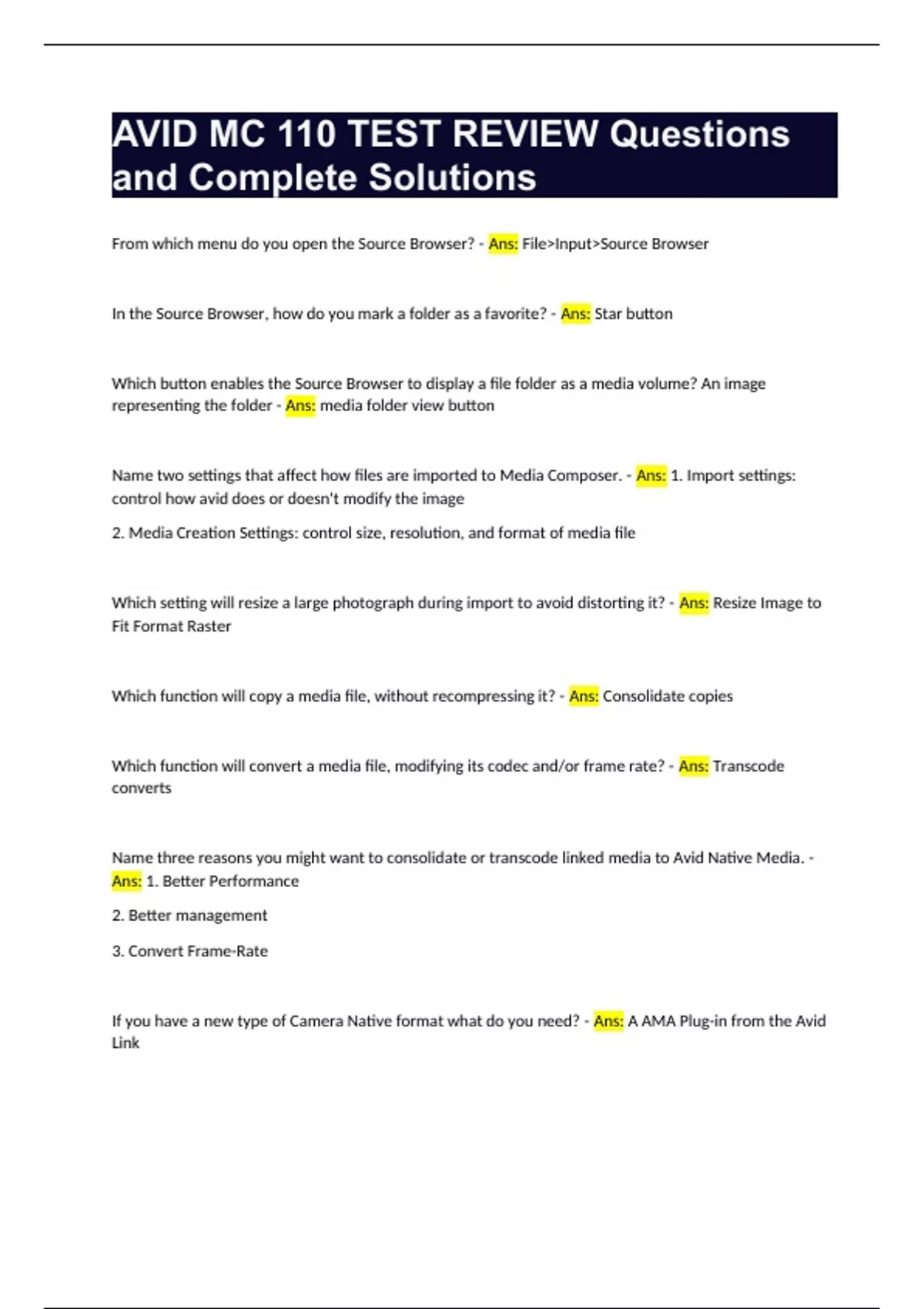 Avid MC Lesson 2 Exam Questions and Complete Solutions From which menu do you open the Source Browser? - Ans: File -> Input -> Source Browser Right-Click in an open bin -> Input -> Source Browser In the Source Browser, how do you mark a folder as a favorite? - Ans: Select folder and click Star in top left of source browser window How do you remove a folder from the Favorites list in the Soruce Browser? - Ans: Click the Star next to the folder and it goes away Which button enables the Source Browser to display a file folder as a media volume? An image representing the folder - Ans: Media Folder View button Name two settings that affect how files are imported to Media Composer. - Ans: 1. Import settings: control how avid does or doesn't modify the image 2. Media Creation Settings: control size, resolution, and format of media file Which setting will resize a large photograph during import to avoid distorting it? - Ans: Resize Image to Fit Format Raster Which function will copy a media file, without recompressing it? - Ans: Consolidate copies Which function will convert a media file, modifying its codec and/or frame rate? - Ans: Transcode converts Name three reasons you might want to consolidate or transcode linked media to Avid Native Media. - Ans: 1. Better Performance 2. Better management 3. Convert Frame-Rate Three ways to input in Source Browser - Ans: 1. Tape capture 2. Import 3. Link If you have a new type of Camera Native format what do you need? - Ans: A AMA Plug-in from the Avid Link Three categories in the Source Browser - Ans: 1. Explore: all folders 2. Favorites: favorite folders 3. Recent In the source Browser what View modes exist - Ans: 1. Frame view 2. List view