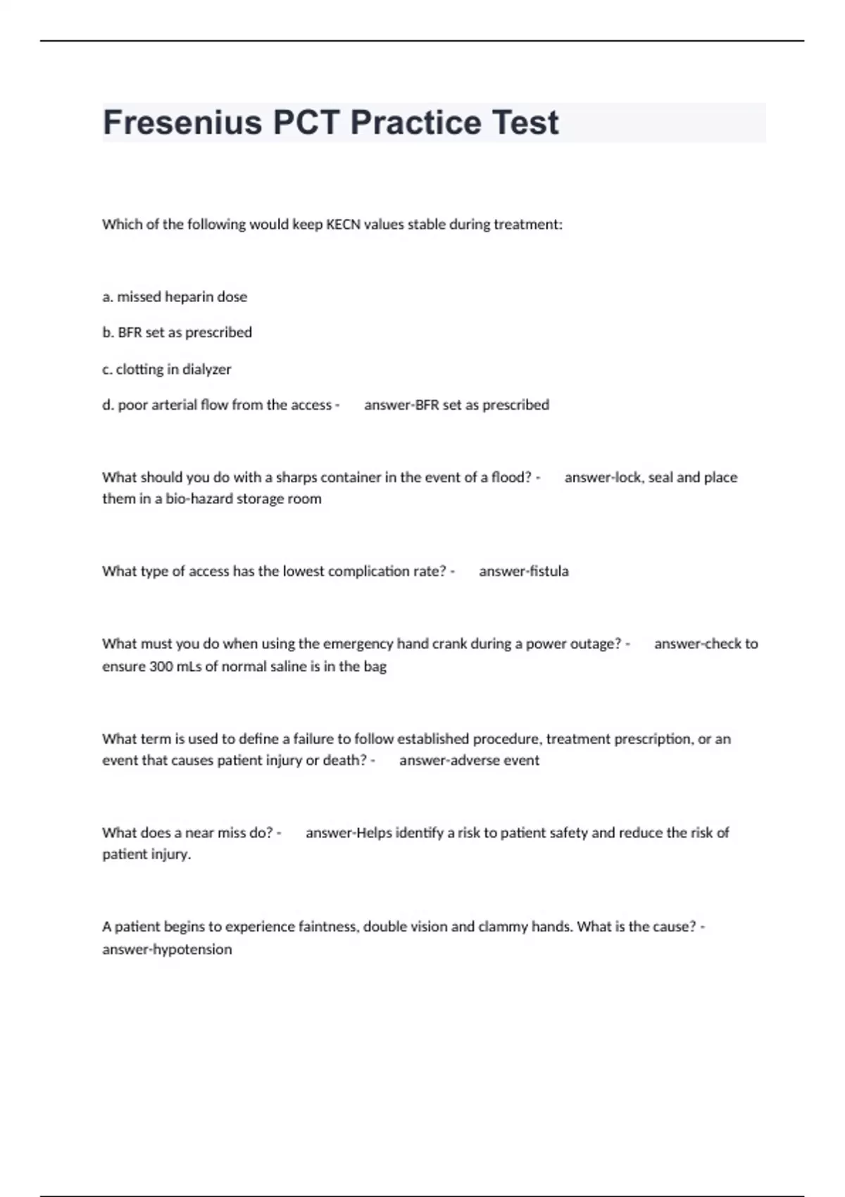 Which of the following would keep KECN values stable during treatment: a. missed heparin dose b. BFR set as prescribed c. clotting in dialyzer d. poor arterial flow from the access - answer-BFR set as prescribed What should you do with a sharps container in the event of a flood? - answer-lock, seal and place them in a bio-hazard storage room What type of access has the lowest complication rate? - answer-fistula What must you do when using the emergency hand crank during a power outage? - answer-check to ensure 300 mLs of normal saline is in the bag What term is used to define a failure to follow established procedure, treatment prescription, or an event that causes patient injury or death? - answer-adverse event What does a near miss do? - answer-Helps identify a risk to patient safety and reduce the risk of patient injury. A patient begins to experience faintness, double vision and clammy hands. What is the cause? - answer-hypotension