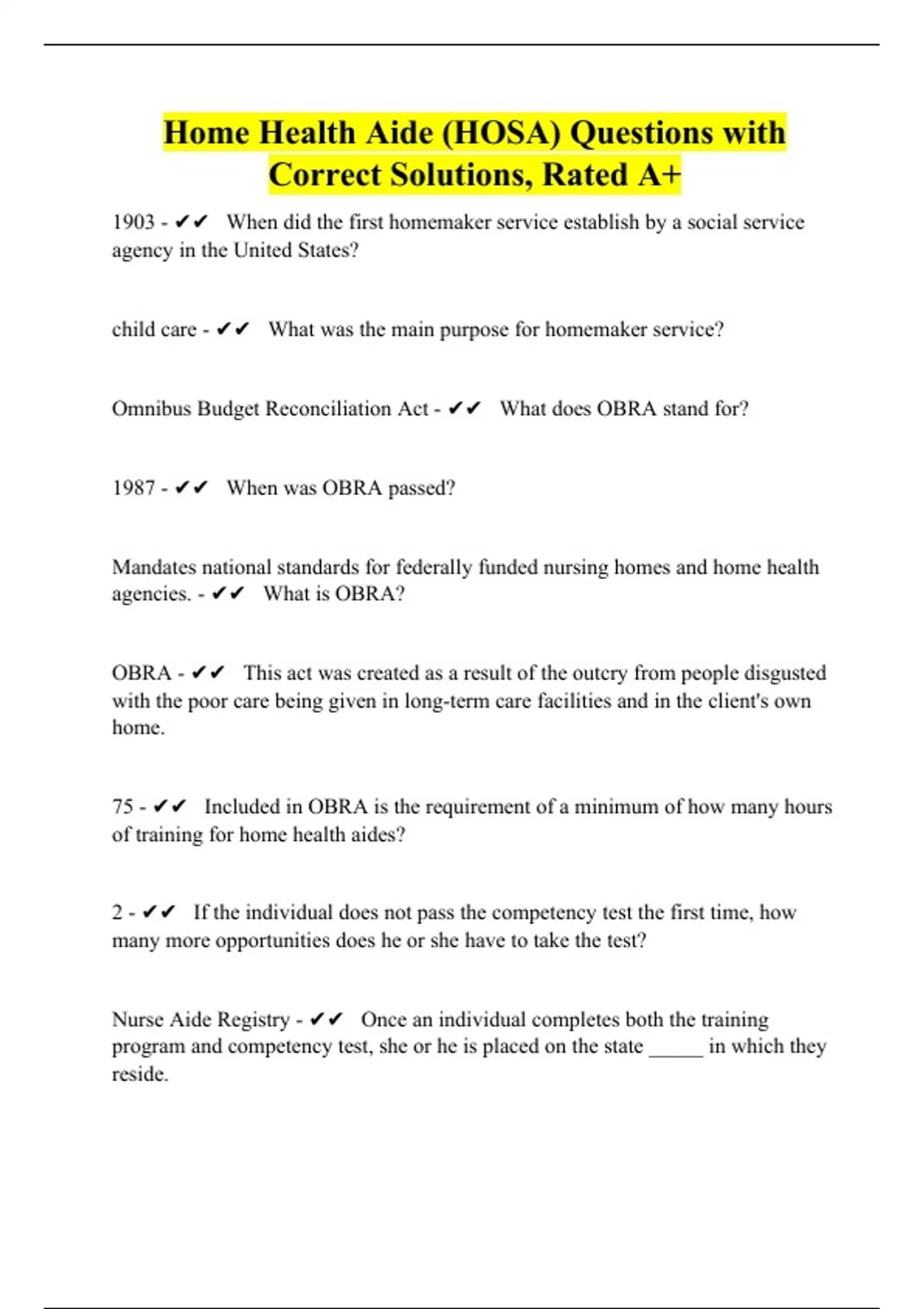 Home Health Aide (HOSA) Questions with Correct Solutions, Rated A+