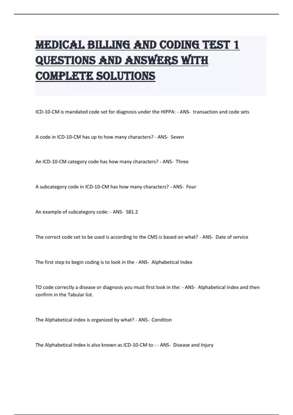 Medical Billing and Coding Test 1 Questions and Answers with complete solutions ICD-10-CM is mandated code set for diagnosis under the HIPPA: - ANS- transaction and code sets A code in ICD-10-CM has up to how many characters? - ANS- Seven An ICD-10-CM category code has how many characters? - ANS- Three A subcategory code in ICD-10-CM has how many characters? - ANS- Four An example of subcategory code: - ANS- S81.2 The correct code set to be used is according to the CMS is based on what? - ANS- Date of service The first step to begin coding is to look in the - ANS- Alphabetical Index TO code correctly a disease or diagnosis you must first look in the: - ANS- Alphabetical Index and then confirm in the Tabular list. The Alphabetical index is organized by what? - ANS- Conditon The Alphabetical Index is also known as ICD-10-CM to : - ANS- Disease and Injury Which code number is based on their anatomical site and are divided by description? - ANS- Subterms Define Subterm - ANS- Word of phrase that discribes a main term in the alphabetical index If you have patient presents with blindness following an accident with a bow and arrow when he was a child, what is the main term? - ANS- Blindness The term acquired, congenital, and both eyes that may modify the main term in the diagnostic statement is considered : - ANS- Non-essensial Modifier. If a cross reference appears after a main term, the coder must: - ANS- look up the term that follows the word SEE in the index. What type of code describes two diagnoses or a diagnosis with an associated complication? - ANS- Combining Code What letter is not used in ICD-10-CM coding? - ANS- U A valid code must have at least___characters - ANS- 3 When you see the colon punctuation it means: - ANS- Incompleate term If the Tabular index has the instruction to ( code first underlying disease) it means the code selected would be listed: - ANS- second The primary diagnosis coding is listed when?> - ANS- FIrst IF the patient has a co-existing condition that the physicaion diagnosis and treats the coder must: - ANS- Use a combo code to code both diagnosis When an established diagnosis has been determined the coder must code : - ANS- The established code The ICD-10-CM outpatient coding guidelines what can be coded: - ANS- Abnormal test results IN the medical record if it mentions a type or form of a condition that is not listed the code would - ANS- "other" How many chapters does ICD-10CM have? - ANS- 21 chapters if you are coding in an outpatient setting what is the cheif complaint - ANS- " CC" Main issue for visit What is the final step in coding? - ANS- Check compliance with any applicable official guide lines What must a coder do to verify when selecting a code 1 the tabular List? - ANS- IF you need to list multiple codes and if they are in the correct order. The ICD-10-CM offers a ; - ANS- High level of specificity and an extension for expanded detail that ICD-9-CM Level 1 codes in HCPS are : - ANS- CPT codes What does CPT Category 11 codes report: - ANS- Performance Measures. When a medical practice receives revised edition of CPT, what activities should be followed - ANS- Update encounter forms, update patient billing software, educate medical staff. ALL OF THE ABOVE! IN CPT what appendix contains the Summary of Modifier 51 exempt codes? - ANS- Appendix A In CPT, a + signs indicates: - ANS- An Add on In CPT, a triangle next to a code indicates: - ANS- The discripter has changed The CPT code that is listed first for an enounter is the procedure that: - ANS- Is the most resource intensive procedure If a doctor performed a carpal tunnel relased on the right and left median nerves during the same operative session what is the correct modifirer? - ANS- 51 A chest X-ray was performed before placing a chest tube and then after the chest tube placement to verify the position what is the modifier - ANS- 76 A patient is scheduled to have a arthroscopy of the left knee. The dr inserted the arthroscope and the patient went into respiratory distress. the arthroscope was withdrawn and procedure was terminated. what is the correct modifier? - ANS- 53 E/M is the abbreviation for: - ANS- Evaluation Managment What is the correct process for selecting CPT codes? - ANS- Technical and Professional Comp which level is the most complete that a dr can perform? - ANS- Comprehensive
