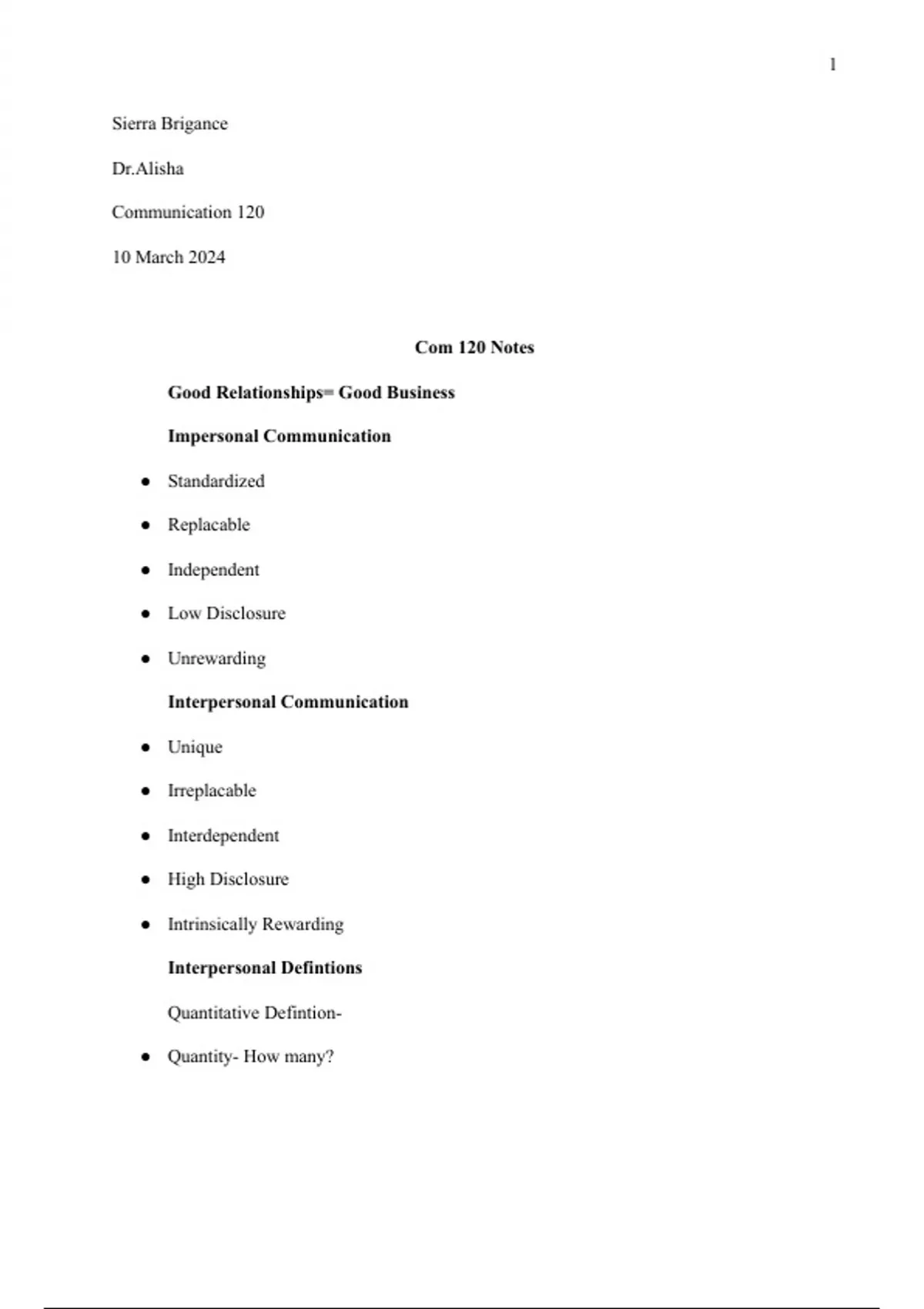 Notes for Interpersonal Communication course.