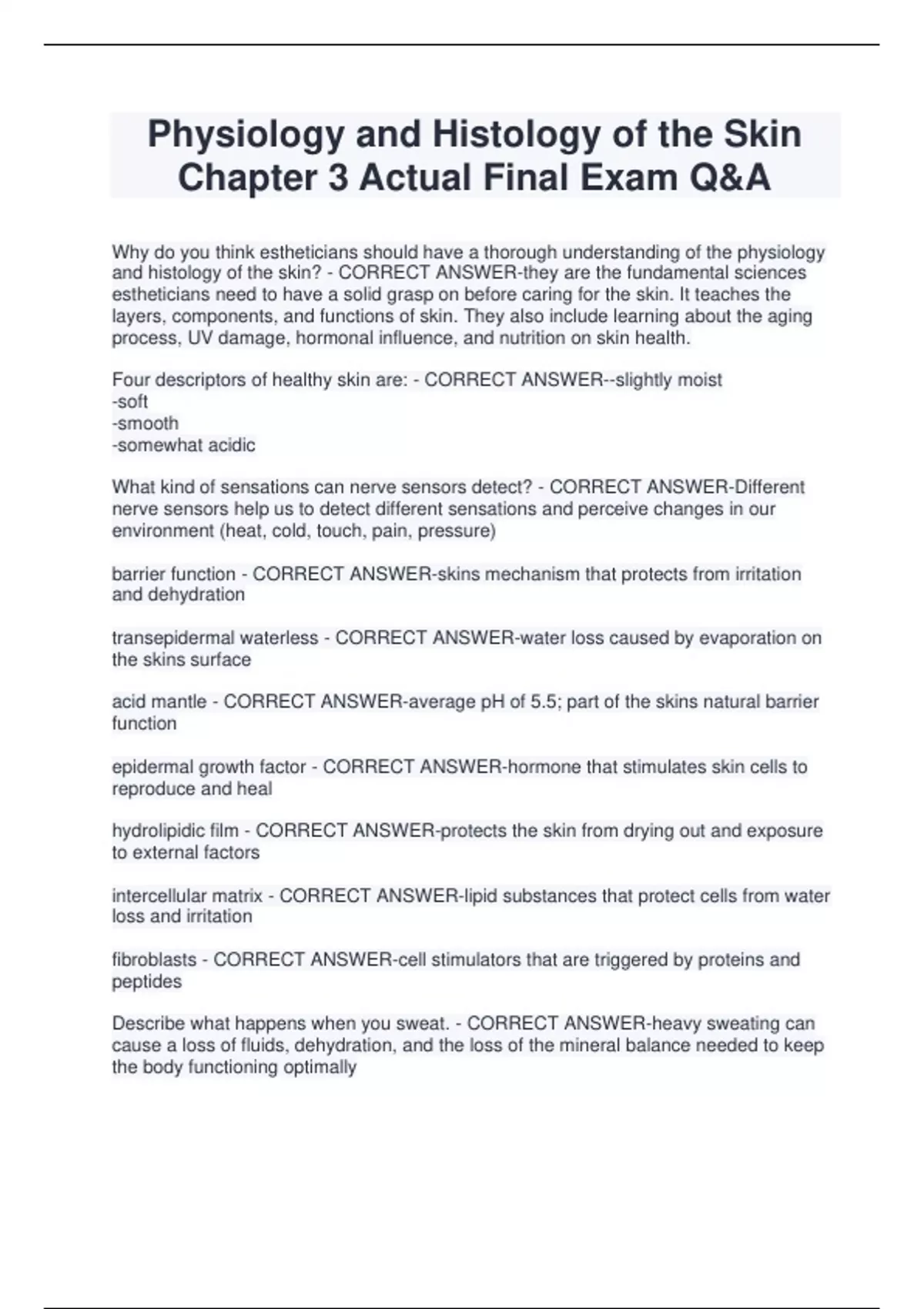 Physiology and Histology of the Skin Chapter 3 Actual Final Exam Q&A Why do you think estheticians should have a thorough understanding of the physiology and histology of the skin? - CORRECT ANSWER-they are the fundamental sciences estheticians need to have a solid grasp on before caring for the skin. It teaches the layers, components, and functions of skin. They also include learning about the aging process, UV damage, hormonal influence, and nutrition on skin health. Four descriptors of healthy skin are: - CORRECT ANSWER--slightly moist -soft -smooth -somewhat acidic What kind of sensations can nerve sensors detect? - CORRECT ANSWER-Different nerve sensors help us to detect different sensations and perceive changes in our environment (heat, cold, touch, pain, pressure) barrier function - CORRECT ANSWER-skins mechanism that protects from irritation and dehydration transepidermal waterless - CORRECT ANSWER-water loss caused by evaporation on the skins surface acid mantle - CORRECT ANSWER-average pH of 5.5; part of the skins natural barrier function epidermal growth factor - CORRECT ANSWER-hormone that stimulates skin cells to reproduce and heal hydrolipidic film - CORRECT ANSWER-protects the skin from drying out and exposure to external factors intercellular matrix - CORRECT ANSWER-lipid substances that protect cells from water loss and irritation fibroblasts - CORRECT ANSWER-cell stimulators that are triggered by proteins and peptides Describe what happens when you sweat. - CORRECT ANSWER-heavy sweating can cause a loss of fluids, dehydration, and the loss of the mineral balance needed to keep the body functioning optimally