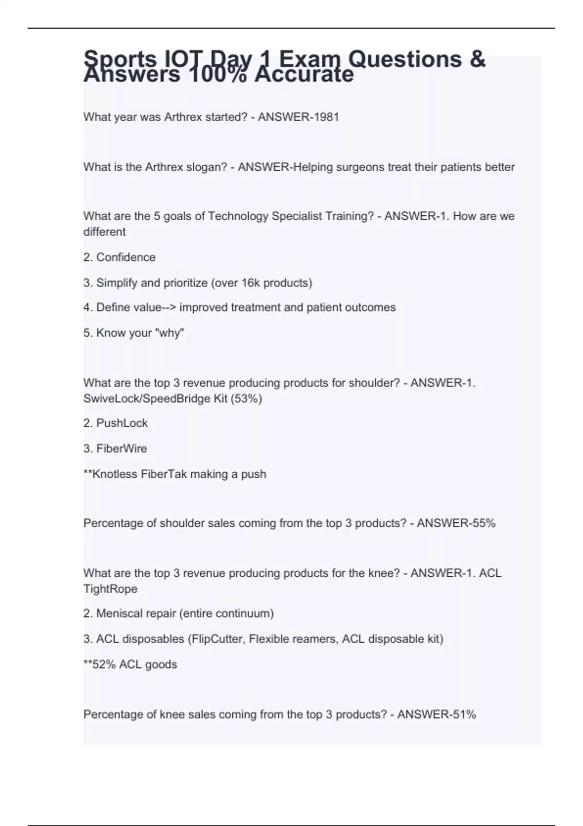 What year was Arthrex started? - ANSWER-1981 What is the Arthrex slogan? - ANSWER-Helping surgeons treat their patients better What are the 5 goals of Technology Specialist Training? - ANSWER-1. How are we different 2. Confidence 3. Simplify and prioritize (over 16k products) 4. Define value-- improved treatment and patient outcomes 5. Know your "why" What are the top 3 revenue producing products for shoulder? - ANSWER-1. SwiveLock/SpeedBridge Kit (53%) 2. PushLock 3. FiberWire **Knotless FiberTak making a push Percentage of shoulder sales coming from the top 3 products? - ANSWER-55% What are the top 3 revenue producing products for the knee? - ANSWER-1. ACL TightRope 2. Meniscal repair (entire continuum) 3. ACL disposables (FlipCutter, Flexible reamers, ACL disposable kit) **52% ACL goods Percentage of knee sales coming from the top 3 products? - ANSWER-51%