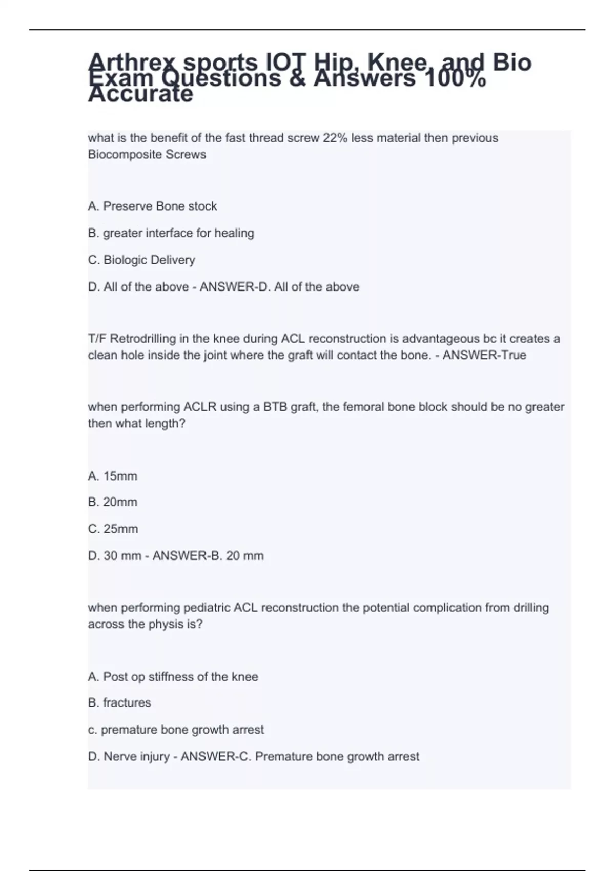 what is the benefit of the fast thread screw 22% less material then previous Biocomposite Screws A. Preserve Bone stock B. greater interface for healing C. Biologic Delivery D. All of the above - ANSWER-D. All of the above T/F Retrodrilling in the knee during ACL reconstruction is advantageous bc it creates a clean hole inside the joint where the graft will contact the bone. - ANSWER-True when performing ACLR using a BTB graft, the femoral bone block should be no greater then what length? A. 15mm B. 20mm C. 25mm D. 30 mm - ANSWER-B. 20 mm when performing pediatric ACL reconstruction the potential complication from drilling across the physis is? A. Post op stiffness of the knee B. fractures c. premature bone growth arrest D. Nerve injury - ANSWER-C. Premature bone growth arrest