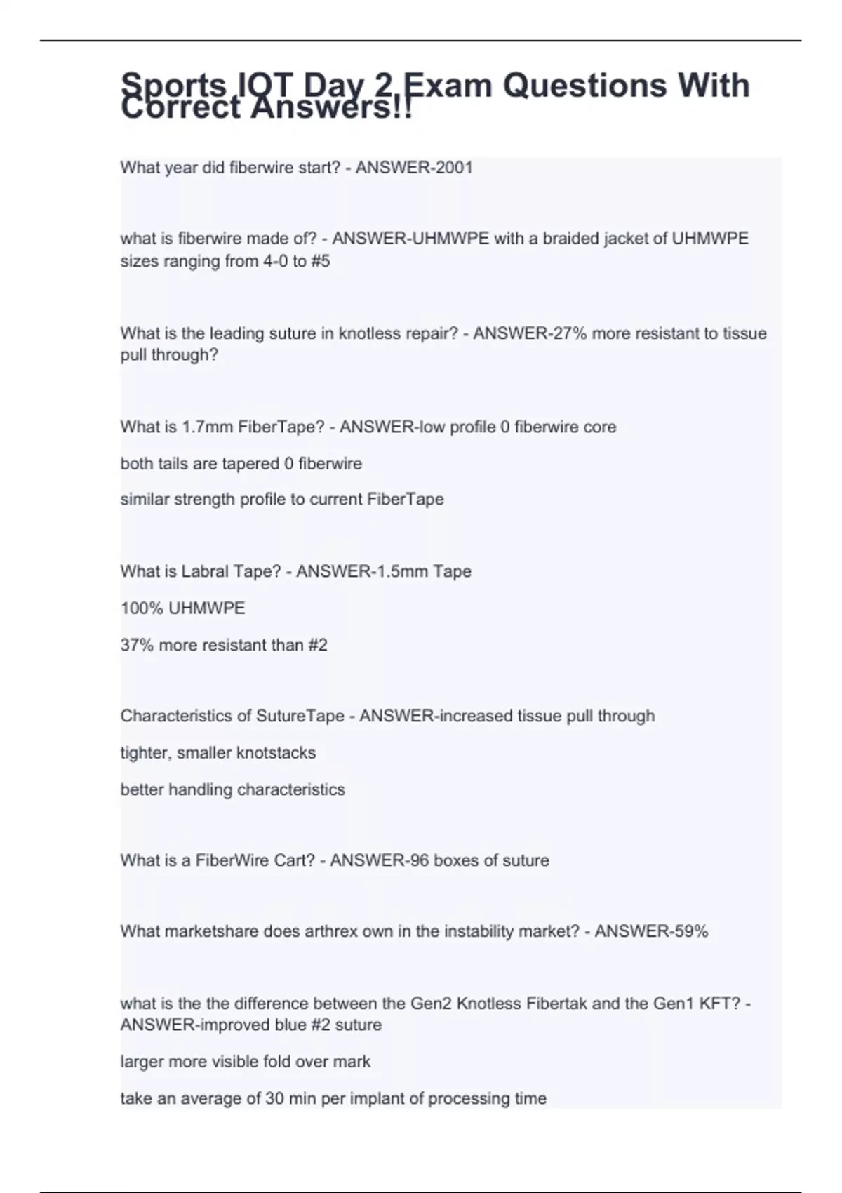 What year did fiberwire start? - ANSWER-2001 what is fiberwire made of? - ANSWER-UHMWPE with a braided jacket of UHMWPE sizes ranging from 4-0 to #5 What is the leading suture in knotless repair? - ANSWER-27% more resistant to tissue pull through? What is 1.7mm FiberTape? - ANSWER-low profile 0 fiberwire core both tails are tapered 0 fiberwire similar strength profile to current FiberTape What is Labral Tape? - ANSWER-1.5mm Tape 100% UHMWPE 37% more resistant than #2 Characteristics of SutureTape - ANSWER-increased tissue pull through tighter, smaller knotstacks better handling characteristics What is a FiberWire Cart? - ANSWER-96 boxes of suture What marketshare does arthrex own in the instability market? - ANSWER-59% what is the the difference between the Gen2 Knotless Fibertak and the Gen1 KFT? - ANSWER-improved blue #2 suture