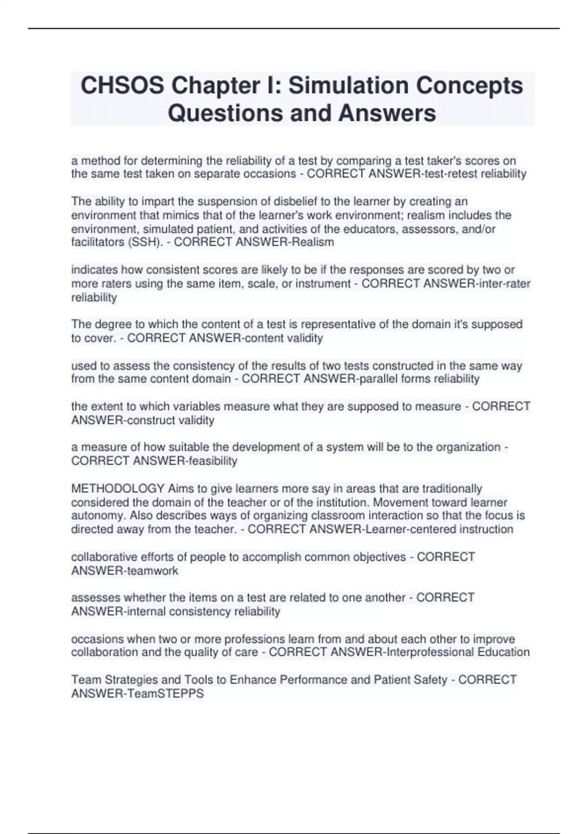 CHSOS Chapter I: Simulation Concepts Questions and Answers a method for determining the reliability of a test by comparing a test taker's scores on the same test taken on separate occasions - CORRECT ANSWER-test-retest reliability The ability to impart the suspension of disbelief to the learner by creating an environment that mimics that of the learner's work environment; realism includes the environment, simulated patient, and activities of the educators, assessors, and/or facilitators (SSH). - CORRECT ANSWER-Realism