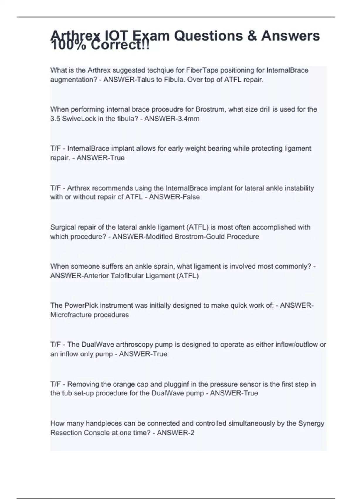 What is the Arthrex suggested techqiue for FiberTape positioning for InternalBrace augmentation? - ANSWER-Talus to Fibula. Over top of ATFL repair. When performing internal brace proceudre for Brostrum, what size drill is used for the 3.5 SwiveLock in the fibula? - ANSWER-3.4mm T/F - InternalBrace implant allows for early weight bearing while protecting ligament repair. - ANSWER-True T/F - Arthrex recommends using the InternalBrace implant for lateral ankle instability with or without repair of ATFL - ANSWER-False Surgical repair of the lateral ankle ligament (ATFL) is most often accomplished with which procedure? - ANSWER-Modified Brostrom-Gould Procedure When someone suffers an ankle sprain, what ligament is involved most commonly? - ANSWER-Anterior Talofibular Ligament (ATFL) The PowerPick instrument was initially designed to make quick work of: - ANSWER-Microfracture procedures T/F - The DualWave arthroscopy pump is designed to operate as either inflow/outflow or an inflow only pump - ANSWER-True T/F - Removing the orange cap and plugginf in the pressure sensor is the first step in the tub set-up procedure for the DualWave pump - ANSWER-True