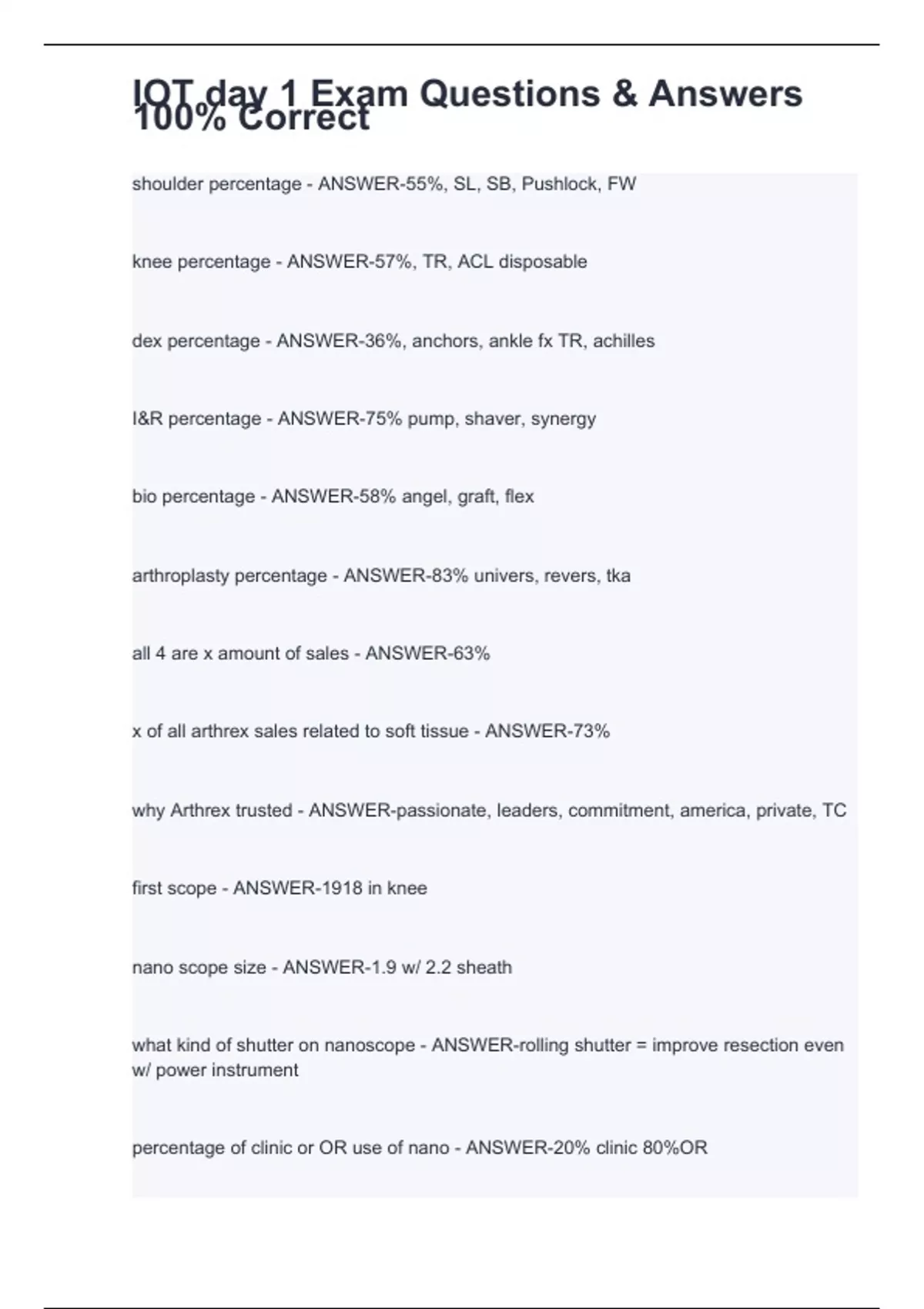 shoulder percentage - ANSWER-55%, SL, SB, Pushlock, FW knee percentage - ANSWER-57%, TR, ACL disposable dex percentage - ANSWER-36%, anchors, ankle fx TR, achilles I&R percentage - ANSWER-75% pump, shaver, synergy bio percentage - ANSWER-58% angel, graft, flex arthroplasty percentage - ANSWER-83% univers, revers, tka all 4 are x amount of sales - ANSWER-63% x of all arthrex sales related to soft tissue - ANSWER-73% why Arthrex trusted - ANSWER-passionate, leaders, commitment, america, private, TC first scope - ANSWER-1918 in knee nano scope size - ANSWER-1.9 w/ 2.2 sheath what kind of shutter on nanoscope - ANSWER-rolling shutter = improve resection even w/ power instrument