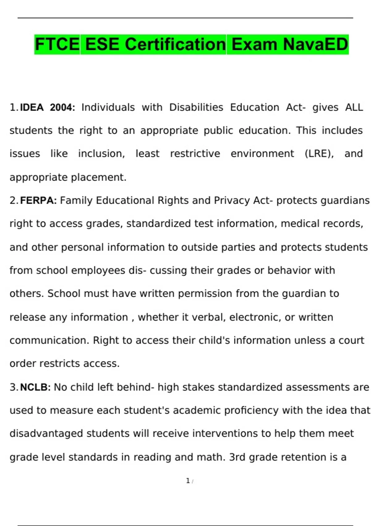 FTCE ESE Certification Exam NavaED Questions with 100% Correct Answers | Verified | Latest Update 2024