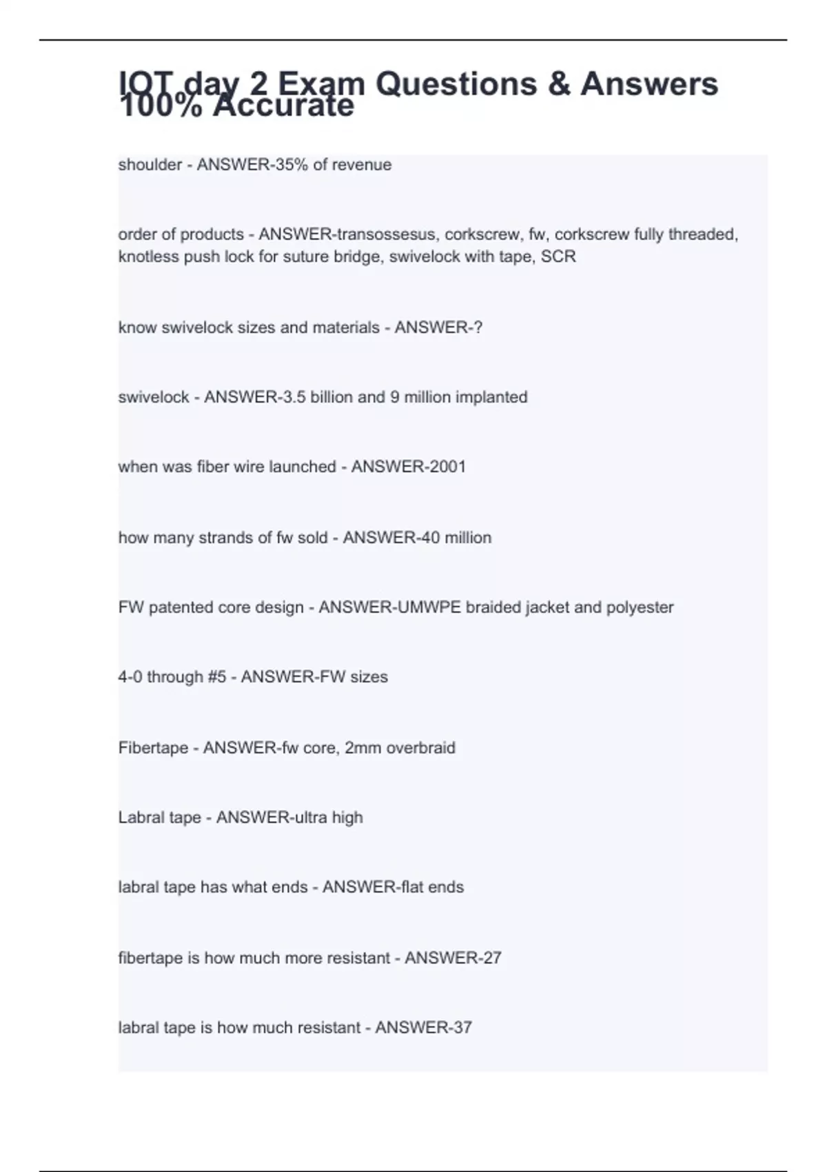 shoulder - ANSWER-35% of revenue order of products - ANSWER-transossesus, corkscrew, fw, corkscrew fully threaded, knotless push lock for suture bridge, swivelock with tape, SCR know swivelock sizes and materials - ANSWER-? swivelock - ANSWER-3.5 billion and 9 million implanted when was fiber wire launched - ANSWER-2001 how many strands of fw sold - ANSWER-40 million FW patented core design - ANSWER-UMWPE braided jacket and polyester 4-0 through #5 - ANSWER-FW sizes Fibertape - ANSWER-fw core, 2mm overbraid Labral tape - ANSWER-ultra high labral tape has what ends - ANSWER-flat ends fibertape is how much more resistant - ANSWER-27