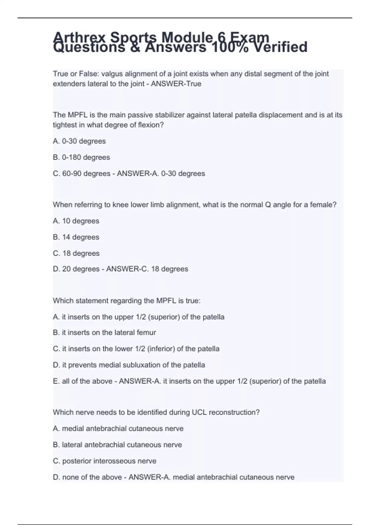 True or False: valgus alignment of a joint exists when any distal segment of the joint extenders lateral to the joint - ANSWER-True The MPFL is the main passive stabilizer against lateral patella displacement and is at its tightest in what degree of flexion? A. 0-30 degrees B. 0-180 degrees C. 60-90 degrees - ANSWER-A. 0-30 degrees When referring to knee lower limb alignment, what is the normal Q angle for a female? A. 10 degrees B. 14 degrees C. 18 degrees D. 20 degrees - ANSWER-C. 18 degrees Which statement regarding the MPFL is true: A. it inserts on the upper 1/2 (superior) of the patella B. it inserts on the lateral femur C. it inserts on the lower 1/2 (inferior) of the patella D. it prevents medial subluxation of the patella E. all of the above - ANSWER-A. it inserts on the upper 1/2 (superior) of the patella Which nerve needs to be identified during UCL reconstruction? A. medial antebrachial cutaneous nerve B. lateral antebrachial cutaneous nerve C. posterior interosseous nerve D. none of the above - ANSWER-A. medial antebrachial cutaneous nerve