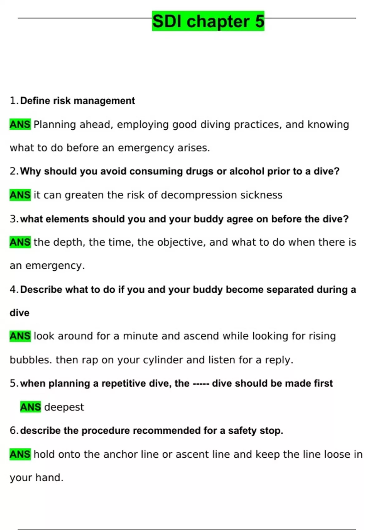 1. Define risk management ANS Planning ahead, employing good diving practices, and knowing what to do before an emergency arises. 2. Why should you avoid consuming drugs or alcohol prior to a dive? ANS it can greaten the risk of decompression sickness 3. what elements should you and your buddy agree on before the dive? ANS the depth, the time, the objective, and what to do when there is an emergency. 4. Describe what to do if you and your buddy become separated during a dive ANS look around for a minute and ascend while looking for rising bubbles. then rap on your cylinder and listen for a reply. 5. when planning a repetitive dive, the ----- dive should be made first ANS deepest 6. describe the procedure recommended for a safety stop. ANS hold onto the anchor line or ascent line and keep the line loose in your hand. 7. describe what to do if you exceed the no deco time registered on your computer. ANS ascend normally and stop at the first decompression depth and stay for the required time. perform all required stops until the computer clears you to ascend to the surface. 8. what should you do if you become entangled underwater? ANS figure out how to carefully get untangled and use a dive knife if available. 9. what is the emergency procedure for suspected decompression sickness?- ANS move the affected diver out of danger and activate the EMS and monitor life support signs and provide CPR if necessary. Provide 100% o2 use demand regulator if the diver is breathing. evacuation if necessary