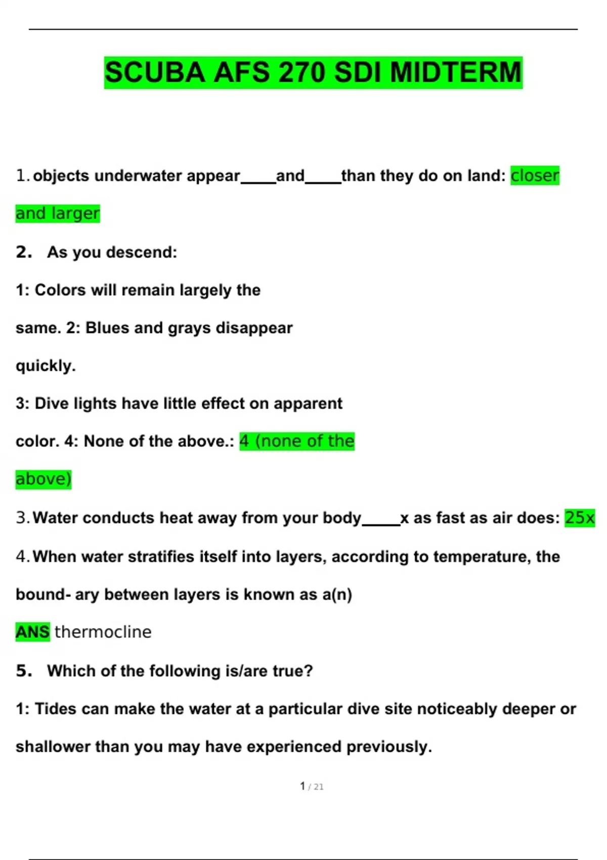 1. objects underwater appear and than they do on land: closer and larger 2. As you descend: 1: Colors will remain largely the same. 2: Blues and grays disappear quickly. 3: Dive lights have little effect on apparent color. 4: None of the above.: 4 (none of the above) 3. Water conducts heat away from your body x as fast as air does: 25x 4. When water stratifies itself into layers, according to temperature, the bound- ary between layers is known as a(n) ANS thermocline 5. Which of the following is/are true? 1: Tides can make the water at a particular dive site noticeably deeper or shallower than you may have experienced previously. 2: Tidal currents can be very strong, making diving difficult or even dangerous. 3: Strong tidal currents can have an adverse effect on visibility. 4: All of the above.: 4 (all of the above) 6. Which of the following is/are true? 1: Water conducts heat away from your body ten times faster than air does. 2: Water conducts heat away from your body 25 times faster than air does. 3: Fresh water conducts heat away from your body faster than salt water does. 4: Salt water conducts heat away from your body faster than fresh water does.: 2 (Water conducts heat away from your body 25 times faster than air does)