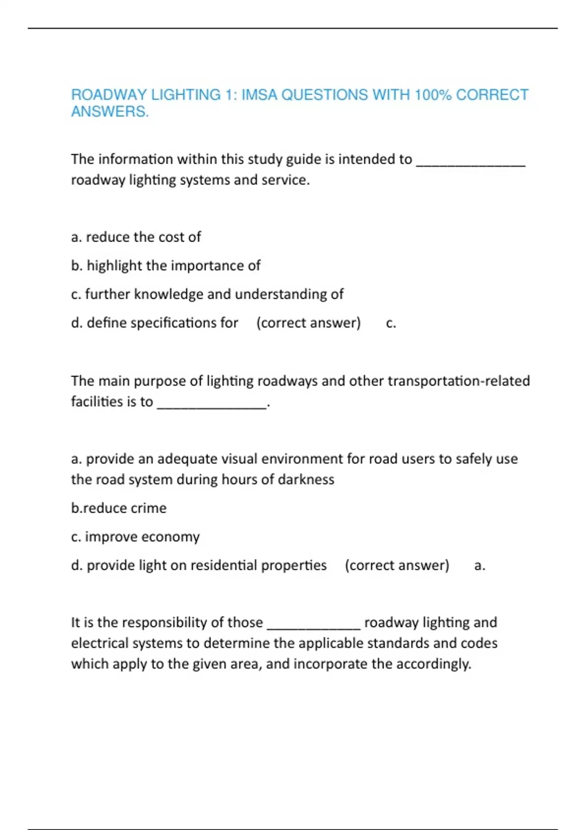 roadway lighting 1 imsa questions with 100 corre