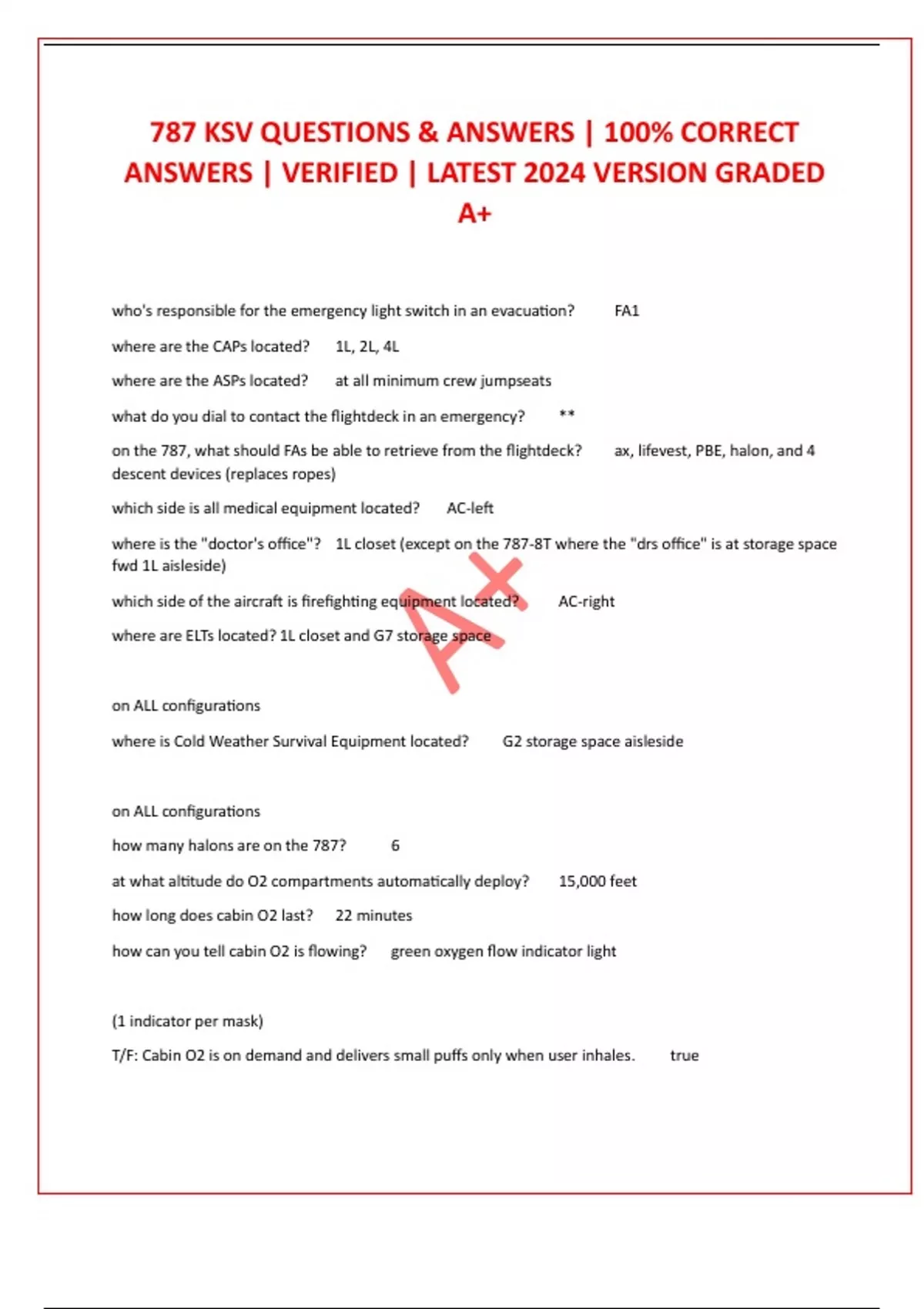 787 KSV QUESTIONS & ANSWERS | 100% CORRECT ANSWERS | VERIFIED | LATEST 2024 VERSION GRADED A+ who's responsible for the emergency light switch in an evacuation? FA1 where are the CAPs located? 1L, 2L, 4L where are the ASPs located? at all minimum crew jumpseats what do you dial to contact the flightdeck in an emergency? ** on the 787, what should FAs be able to retrieve from the flightdeck? ax, lifevest, PBE, halon, and 4 descent devices (replaces ropes) which side is all medical equipment located? AC-left where is the "doctor's office"? 1L closet (except on the 787-8T where the "drs office" is at storage space fwd 1L aisleside) which side of the aircraft is firefighting equipment located? AC-right where are ELTs located? 1L closet and G7 storage space on ALL configurations where is Cold Weather Survival Equipment located? G2 storage space aisleside on ALL configurations