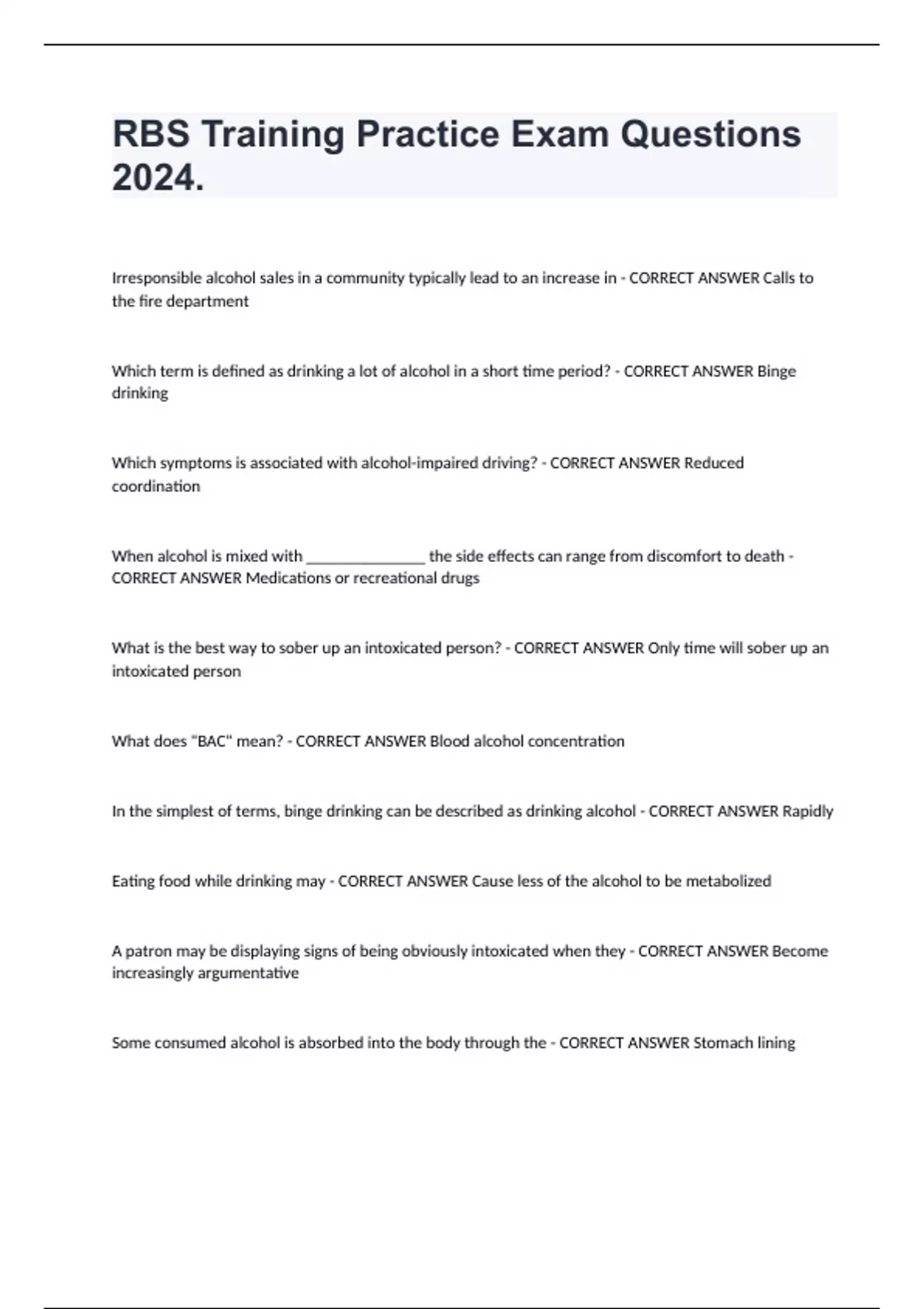 RBS Training Exam Questions Correctly Answered.Irresponsible alcohol sales in a community typically lead to an increase in - CORRECT ANSWER Calls to the fire department Which term is defined as drinking a lot of alcohol in a short time period? - CORRECT ANSWER Binge drinking Which symptoms is associated with alcohol-impaired driving? - CORRECT ANSWER Reduced coordination When alcohol is mixed with ______________ the side effects can range from discomfort to death - CORRECT ANSWER Medications or recreational drugs What is the best way to sober up an intoxicated person? - CORRECT ANSWER Only time will sober up an intoxicated person What does "BAC" mean? - CORRECT ANSWER Blood alcohol concentration In the simplest of terms, binge drinking can be described as drinking alcohol - CORRECT ANSWER Rapidly Eating food while drinking may - CORRECT ANSWER Cause less of the alcohol to be metabolized A patron may be displaying signs of being obviously intoxicated when they - CORRECT ANSWER Become increasingly argumentative Some consumed alcohol is absorbed into the body through the - CORRECT ANSWER Stomach lining What is the primary purpose of ABC's T.R.A.C.E. program? - CORRECT ANSWER Identify and investigate where persons under 21 years of age obtained alcohol and who was killed or obtained serious injury or accident A person with a BAC of 0.05 percent - CORRECT ANSWER Can be arrested for driving under the influence of alcohol? When can a 19-year old legally serve alcoholic beverages in a restaurant? - CORRECT ANSWER When the server's primary responsibility is to serve food