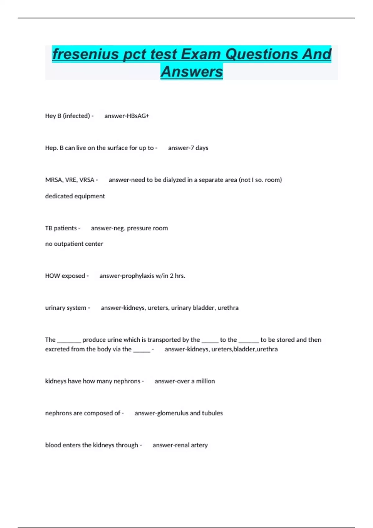 Hey B (infected) - answer-HBsAG+ Hep. B can live on the surface for up to - answer-7 days MRSA, VRE, VRSA - answer-need to be dialyzed in a separate area (not I so. room) dedicated equipment TB patients - answer-neg. pressure room no outpatient center HOW exposed - answer-prophylaxis w/in 2 hrs. urinary system - answer-kidneys, ureters, urinary bladder, urethra The _______ produce urine which is transported by the _____ to the ______ to be stored and then excreted from the body via the _____ - answer-kidneys, ureters,bladder,urethra kidneys have how many nephrons - answer-over a million nephrons are composed of - answer-glomerulus and tubules blood enters the kidneys through - answer-renal artery