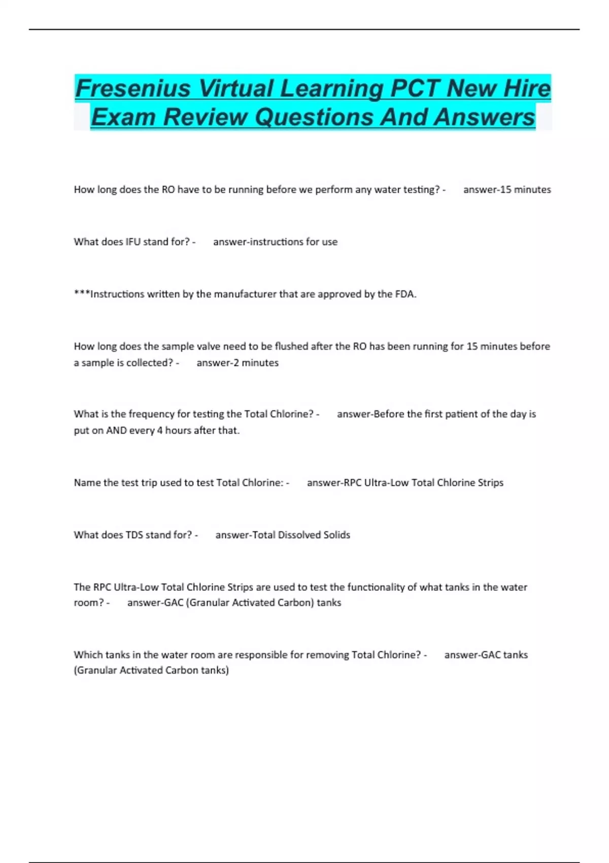 Fresenius Virtual Learning PCT New Hire Exam Review Questions And Answers