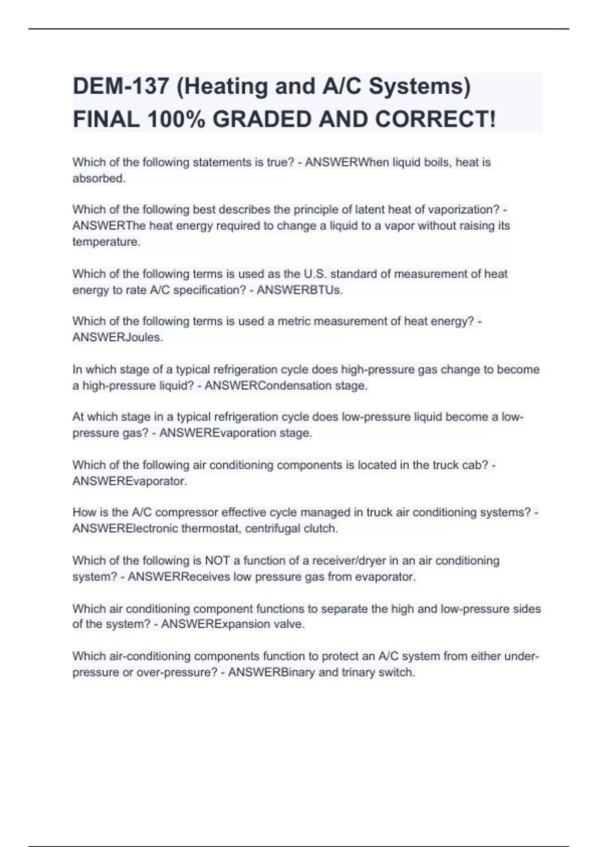 DEM-137 (Heating and A/C Systems) FINAL 100% GRADED AND CORRECT!