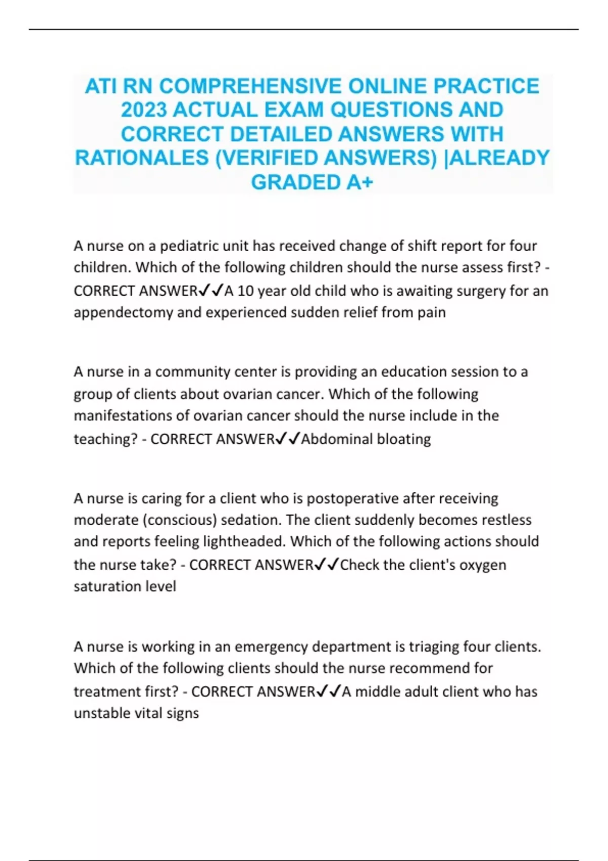 ATI RN COMPREHENSIVE ONLINE PRACTICE 2023 ACTUAL EXAM QUESTIONS AND CORRECT DETAILED ANSWERS WITH RATIONALES (VERIFIED ANSWERS) |ALREADY GRADED A+