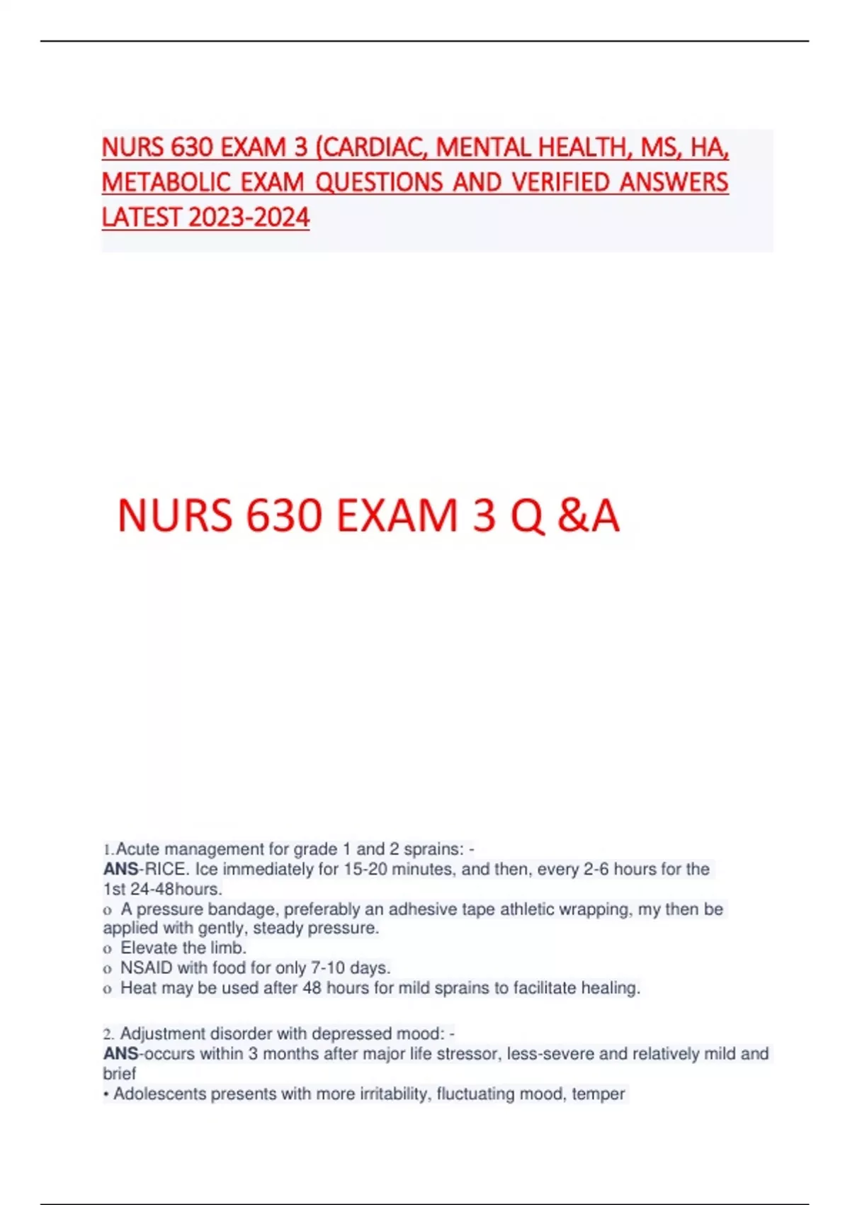Acute management for grade 1 and 2 sprains: - ANS-RICE. Ice immediately for 15-20 minutes, and then, every 2-6 hours for the 1st 24-48hours. o A pressure bandage, preferably an adhesive tape athletic wrapping, my then be applied with gently, steady pressure. o Elevate the limb. o NSAID with food for only 7-10 days. o Heat may be used after 48 hours for mild sprains to facilitate healing. 2. Adjustment disorder with depressed mood: - ANS-occurs within 3 months after major life stressor, less-severe and relatively mild and brief • Adolescents presents with more irritability, fluctuating mood, temper NURS 630 EXAM 3 (CARDIAC, MENTAL HEALTH, MS, HA, METABOLIC EXAM QUESTIONS AND VERIFIED ANSWERS LATEST tantrums, socialwithdrawal, somatic complaints, agitation, separation anxiety, or behavioral problems 3.Children with predominantly hyperactive presentation ADHD – ANS-have a more positive response at moderate to high doses 4. Diagnostic Studies for murmurs – ANS- Chest xray; ECG, ECHO, CBC 5. GAD major symptoms: - ANS- Worry about future eventso Poor-quality sleep o Irritability and tantrums in young children o Preoccupations with past behavior o Overconcern about competence and marked preoccupation with performance o Significant self-consciousness o Restlessness, difficulty concentrating o Somatic complaints o Unexplained fatigue 6.Generalized anxiety disorder (GAD)- - ANS-excessive anxiety, worry, and apprehensive expectations generalized to a number ofdifferent events or activities Children are "worriers" • Innocent murmurs