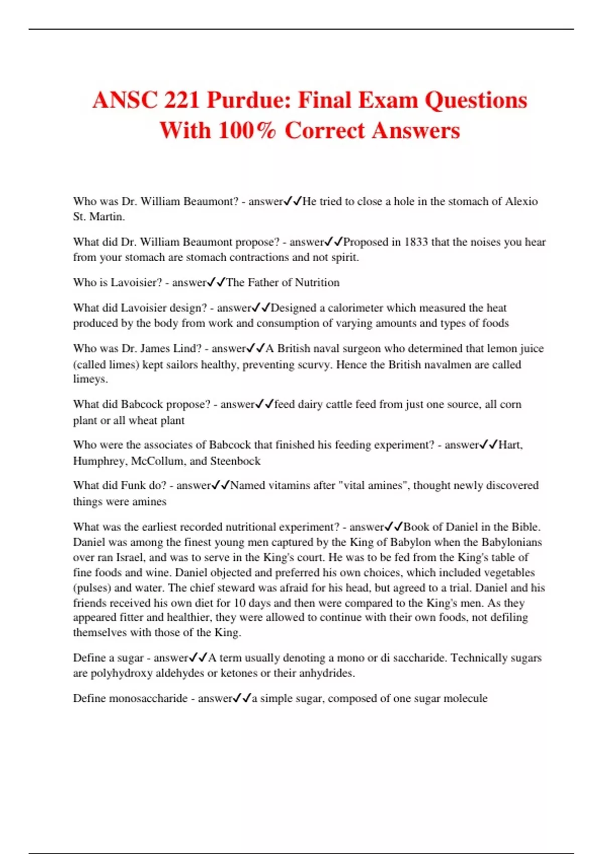 ANSC 221 Purdue: Final Exam Questions With 100% Correct Answers Who was Dr. William Beaumont? - answerHe tried to close a hole in the stomach of Alexio St. Martin. What did Dr. William Beaumont propose? - answerProposed in 1833 that the noises you hear from your stomach are stomach contractions and not spirit. Who is Lavoisier? - answerThe Father of Nutrition What did Lavoisier design? - answerDesigned a calorimeter which measured the heat produced by the body from work and consumption of varying amounts and types of foods Who was Dr. James Lind? - answerA British naval surgeon who determined that lemon juice (called limes) kept sailors healthy, preventing scurvy. Hence the British navalmen are called limeys. What did Babcock propose? - answerfeed dairy cattle feed from just one source, all corn plant or all wheat plant Who were the associates of Babcock that finished his feeding experiment? - answerHart, Humphrey, McCollum, and Steenbock What did Funk do? - answerNamed vitamins after "vital amines", thought newly discovered things were amines What was the earliest recorded nutritional experiment? - answerBook of Daniel in the Bible. Daniel was among the finest young men captured by the King of Babylon when the Babylonians over ran Israel, and was to serve in the King's court. He was to be fed from the King's table of fine foods and wine. Daniel objected and preferred his own choices, which included vegetables (pulses) and water. The chief steward was afraid for his head, but agreed to a trial. Daniel and his friends received his own diet for 10 days and then were compared to the King's men. As they appeared fitter and healthier, they were allowed to continue with their own foods, not defiling themselves with those of the King. Define a sugar - answerA term usually denoting a mono or di saccharide. Technically sugars are polyhydroxy aldehydes or ketones or their anhydrides. Define monosaccharide - answera simple sugar, composed of one sugar molecule Define disaccharide - answerTwo units of simple sugars combined. Example: sucrose is composed of glucose + fructose. Define polysaccharide - answerAny chain of sugar molecules composed of more than two simple sugars is usually called a polysaccharide, although technically there are trisaccharides as well as monosaccharides and disaccharides. Define starch - answerA polysaccharide composed of repeating units of maltose (glucose + glucose) hooked together with alpha bonds. Quite digestible. Two forms are amylase and amylopectin. Define cellulose - answerA complex carbohydrate composed primarily of glucose molecules hooked together with beta bonds. Since the beta bond is unbreakable by any mammalian enzyme (mammals don't make cellulase), it is indigestible without microbial help. Define glycogen - answerA form of polysaccharide that is stored in animal cells for ready energy. It is made of all glucose, with considerable branching in its structure. It is only present in very limited quantities for a ready supply of stored energy. Define glucose - answerA simple sugar, monosaccharide, hexose. The most important sugar as blood sugar. Most polysaccharides (starch, glycogen, cellulose) are made up of repeating units of glucose Define ribose - answerA pentose (5 carbon simple sugar) that is in the structure of RNA and DNA. Its importance nutritionally is much less however, than that would indicate because we do not have to consume it; the body can manufacture what is needed. Define fructose - answerA monosaccharide (hexose). Part of sucrose (talbe sugar). Used in soft drinks as a sweetener in place of more expensive sucrose. Define galactose - answer Define maltose - answerA dissacharide composed of 2 units of glucose hooked together with alpha bonds. It forms the repeating unit of starch. Quite digestible. Define cellobiose - answer Define hemicellulose - answer Define lignin - answer Define amylase - answer Define amylopectin - answerA kind of starch (a polysaccharide) composed of sugar molecules with considerable branching (as contrasted with amylose which contains little branching). Define amylose - answer