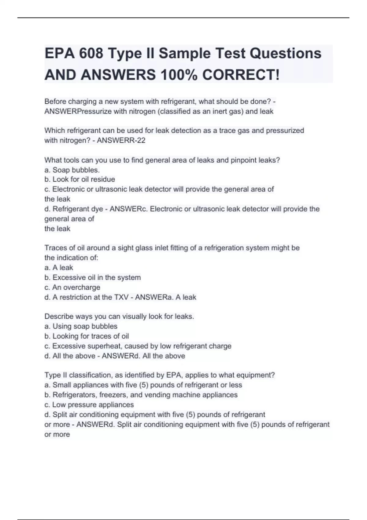 Before charging a new system with refrigerant, what should be done? - ANSWERPressurize with nitrogen (classified as an inert gas) and leak Which refrigerant can be used for leak detection as a trace gas and pressurized with nitrogen? - ANSWERR-22 What tools can you use to find general area of leaks and pinpoint leaks? a. Soap bubbles. b. Look for oil residue c. Electronic or ultrasonic leak detector will provide the general area of the leak d. Refrigerant dye - ANSWERc. Electronic or ultrasonic leak detector will provide the general area of the leak Traces of oil around a sight glass inlet fitting of a refrigeration system might be the indication of: a. A leak b. Excessive oil in the system c. An overcharge d. A restriction at the TXV - ANSWERa. A leak