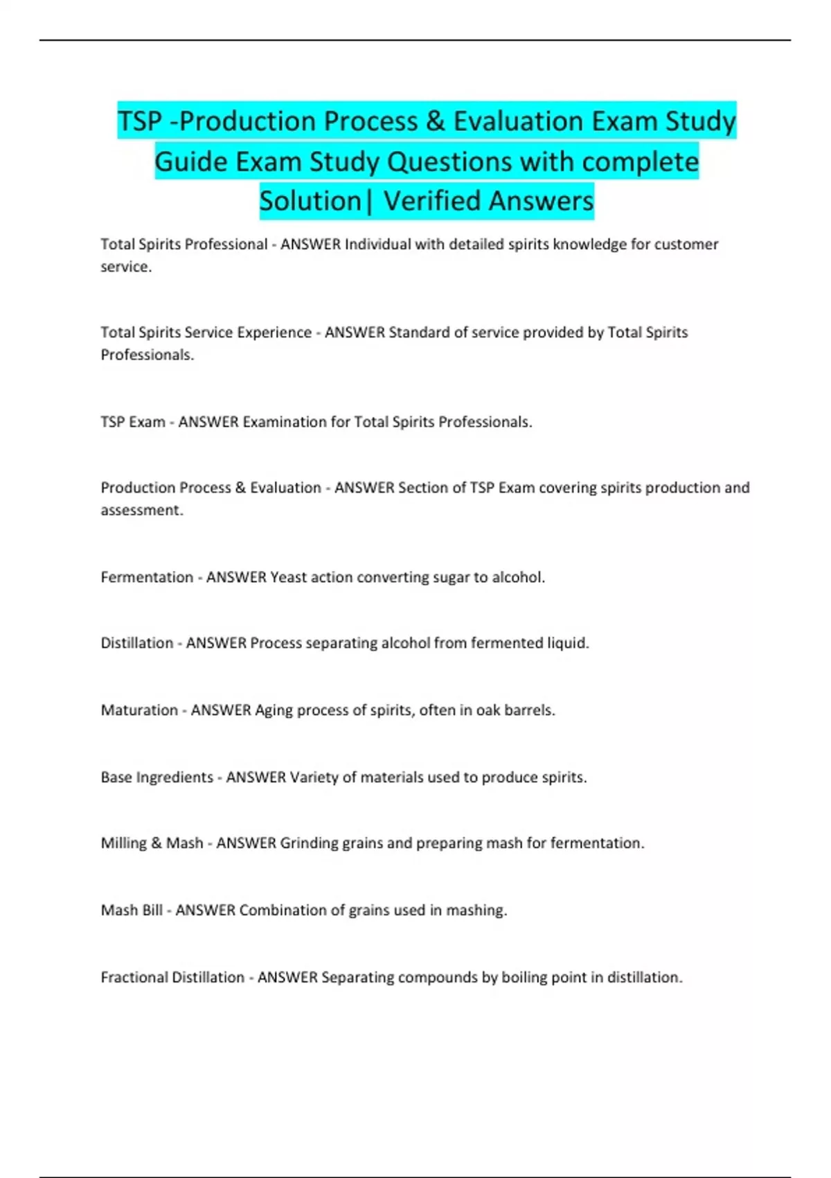 Total Spirits Professional - ANSWER Individual with detailed spirits knowledge for customer service. Total Spirits Service Experience - ANSWER Standard of service provided by Total Spirits Professionals. TSP Exam - ANSWER Examination for Total Spirits Professionals. Production Process & Evaluation - ANSWER Section of TSP Exam covering spirits production and assessment. Fermentation - ANSWER Yeast action converting sugar to alcohol. Distillation - ANSWER Process separating alcohol from fermented liqui