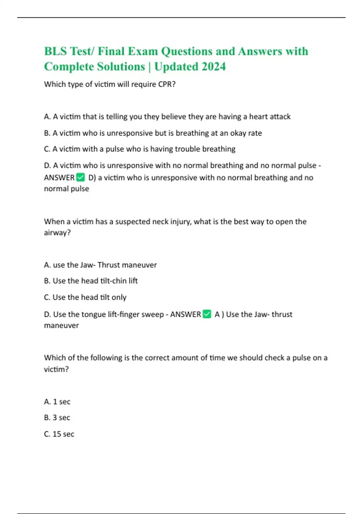 BLS Test/ Final Exam Questions and Answers with Complete Solutions | Updated 2024