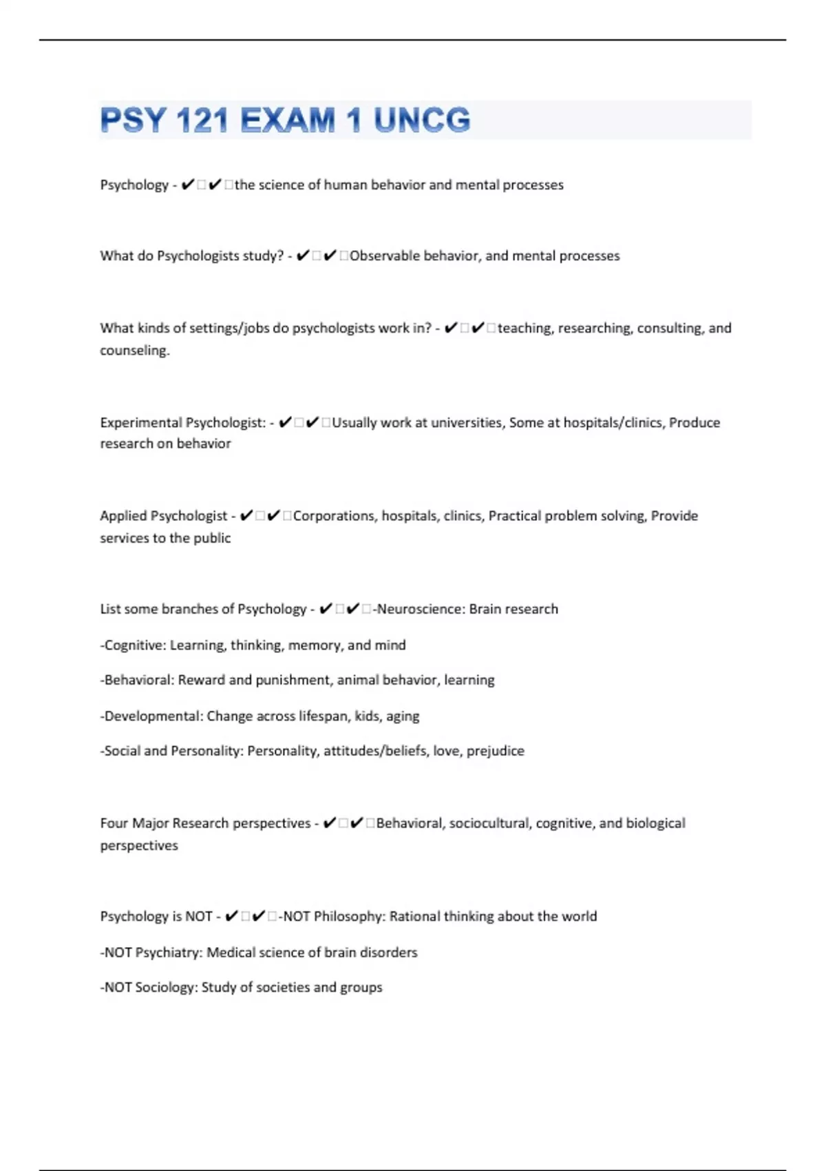 Psychology - ️️the science of human behavior and mental processes What do Psychologists study? - ️️Observable behavior, and mental processes What kinds of settings/jobs do psychologists work in? - ️️teaching, researching, consulting, and counseling. Experimental Psychologist: - ️️Usually work at universities, Some at hospitals/clinics, Produce research on behavior Applied Psychologist - ️️Corporations, hospitals, clinics, Practical problem solving, Provide services to the public List some branches of Psychology - ️️-Neuroscience: Brain research -Cognitive: Learning, thinking, memory, and mind -Behavioral: Reward and punishment, animal behavior, learning -Developmental: Change across lifespan, kids, aging -Social and Personality: Personality, attitudes/beliefs, love, prejudice Four Major Research perspectives - ️️Behavioral, sociocultural, cognitive, and biological perspectives Psychology is NOT - ️️-NOT Philosophy: Rational thinking about the world -NOT Psychiatry: Medical science of brain disorders -NOT Sociology: Study of societies and groups