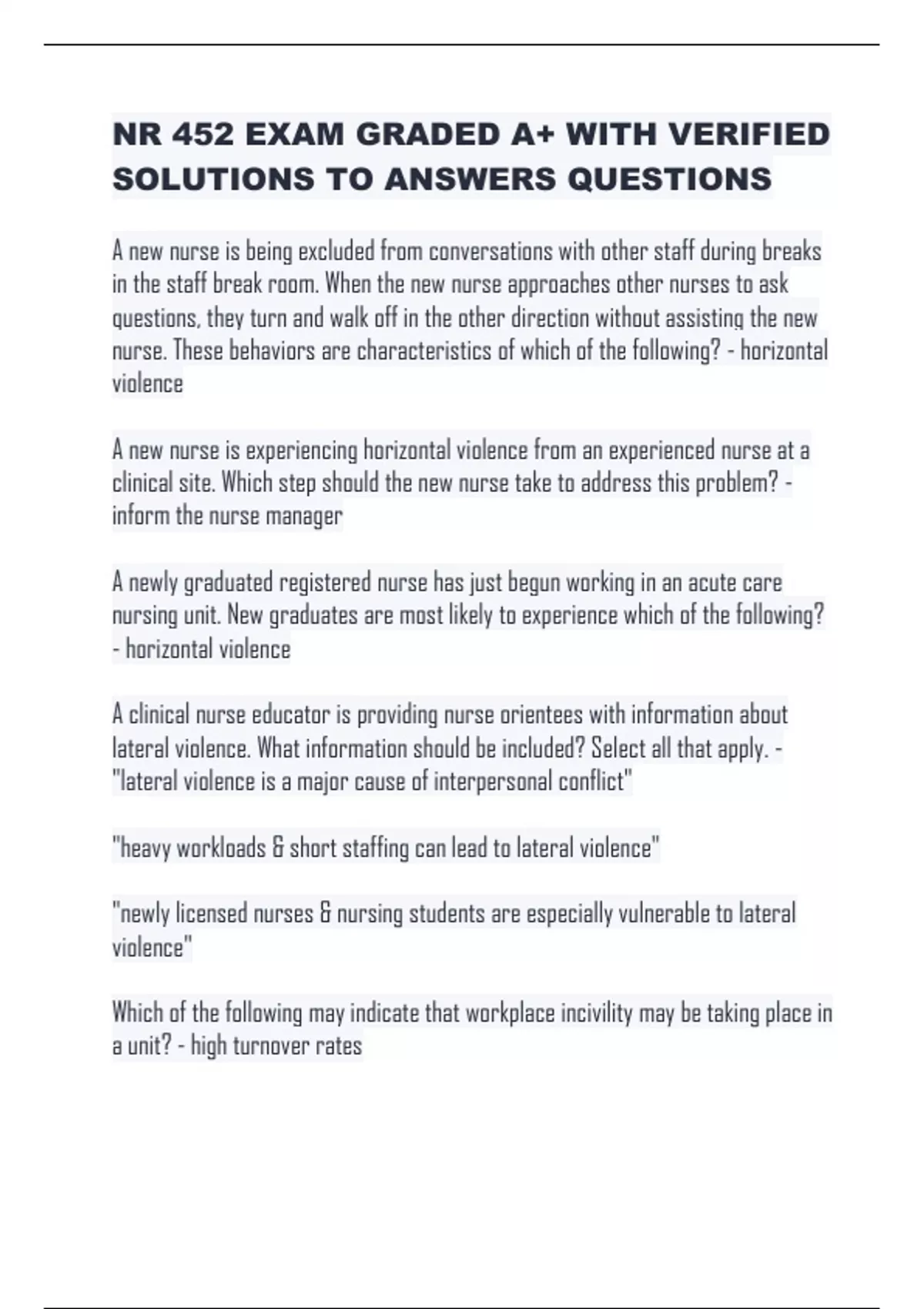 NR 452 EXAM GRADED A+ WITH VERIFIED SOLUTIONS TO ANSWERS QUESTIONS A new nurse is being excluded from conversations with other staff during breaks in the staff break room. When the new nurse approaches other nurses to ask questions, they turn and walk off in the other direction without assisting the new nurse. These behaviors are characteristics of which of the following? - horizontal violence A new nurse is experiencing horizontal violence from an experienced nurse at a clinical site. Which step should the new nurse take to address this problem? - inform the nurse manager A newly graduated registered nurse has just begun working in an acute care nursing unit. New graduates are most likely to experience which of the following? - horizontal violence A clinical nurse educator is providing nurse orientees with information about lateral violence. What information should be included? Select all that apply. - "lateral violence is a major cause of interpersonal conflict" "heavy workloads & short staffing can lead to lateral violence" "newly licensed nurses & nursing students are especially vulnerable to lateral violence" Which of the following may indicate that workplace incivility may be taking place in a unit? - high turnover rates What are the consequences of disruptive behavior, like incivility, lateral violence, and bullying, in the workplace? Select all that apply. - poor work performance accidents & near misses A nurse is aware of lateral violence occurring in the unit between experienced nurses and a newly licensed nurse. Which strategies can the nurse use to help deter lateral violence in the unit? Select all that apply. - do not participate in the bullying notify the supervisor model appropriate behavior raise awareness Staff nurses may be able to avoid bullying behavior by performing which action? - participate in cognitive rehearsal training A nurse demonstrates leadership qualities; therefore, the nurse manager assigns them to be charge nurse for the month. Most of the staff nurses are senior to the nurse. These staff nurses are very articulate, confident, and sometimes aggressive. At the end of the month, the newly promoted charge nurse feels uncomfortable with concerns