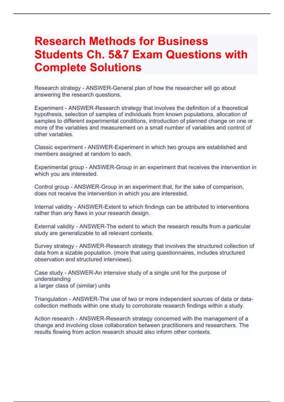 Research strategy - ANSWER-General plan of how the researcher will go about answering the research questions. Experiment - ANSWER-Research strategy that involves the definition of a theoretical hypothesis, selection of samples of individuals from known populations, allocation of samples to different experimental conditions, introduction of planned change on one or more of the variables and measurement on a small number of variables and control of other variables. Classic experiment - ANSWER-Experiment in which two groups are established and members assigned at random to each. Experimental group - ANSWER-Group in an experiment that receives the intervention in which you are interested. Control group - ANSWER-Group in an experiment that, for the sake of comparison, does not receive the intervention in which you are interested. Internal validity - ANSWER-Extent to which findings can be attributed to interventions rather than any flaws in your research design. External validity - ANSWER-The extent to which the research results from a particular study are generalizable to all relevant contexts. Survey strategy - ANSWER-Research strategy that involves the structured collection of data from a sizable population. (more that using questionnaires, includes structured observation and structured interviews). Case study - ANSWER-An intensive study of a single unit for the purpose of understanding a larger class of (similar) units Triangulation - ANSWER-The use of two or more independent sources of data or data-collection methods within one study to corroborate research findings within a study. Action research - ANSWER-Research strategy concerned with the management of a change and involving close collaboration between practitioners and researchers. The results flowing from action research should also inform other contexts.