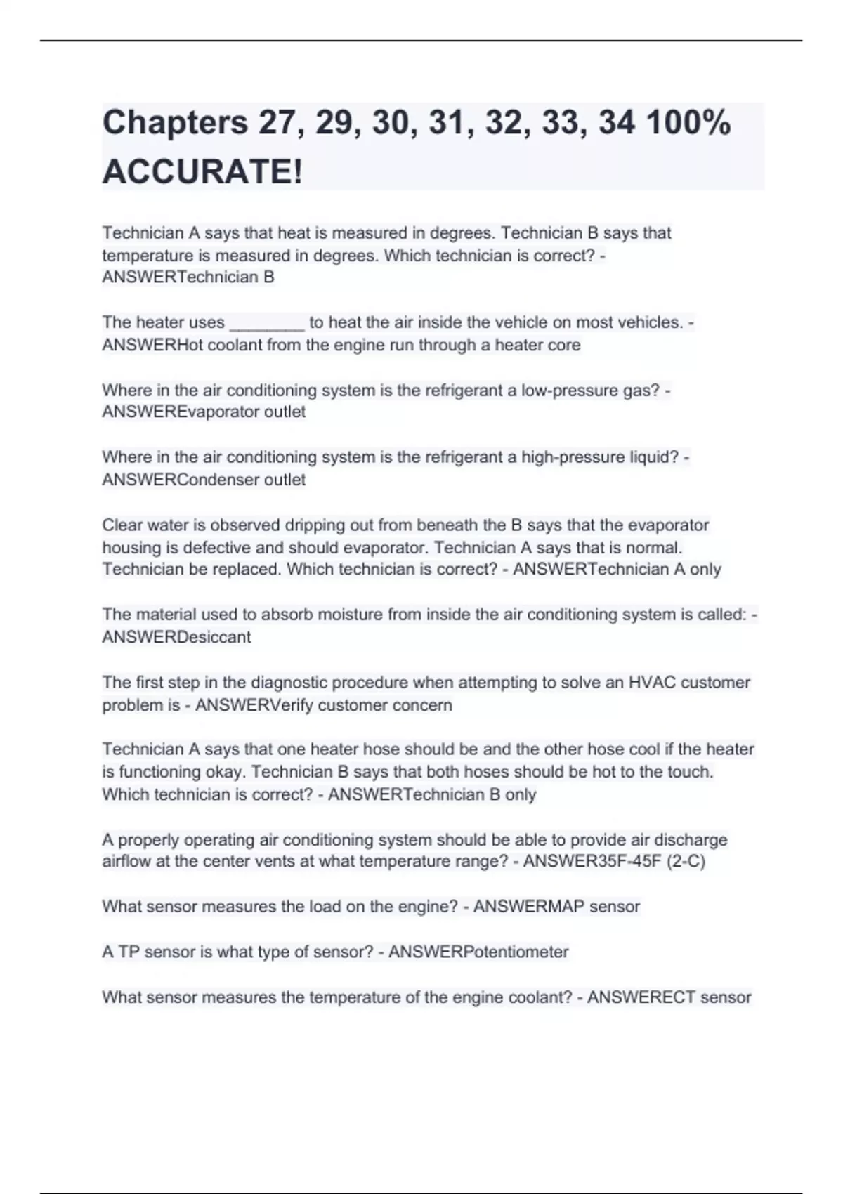 Technician A says that heat is measured in degrees. Technician B says that temperature is measured in degrees. Which technician is correct? - ANSWERTechnician B The heater uses ________ to heat the air inside the vehicle on most vehicles. - ANSWERHot coolant from the engine run through a heater core Where in the air conditioning system is the refrigerant a low-pressure gas? - ANSWEREvaporator outlet Where in the air conditioning system is the refrigerant a high-pressure liquid? - ANSWERCondenser outlet Clear water is observed dripping out from beneath the B says that the evaporator housing is defective and should evaporator. Technician A says that is normal. Technician be replaced. Which technician is correct? - ANSWERTechnician A only The material used to absorb moisture from inside the air conditioning system is called: - ANSWERDesiccant