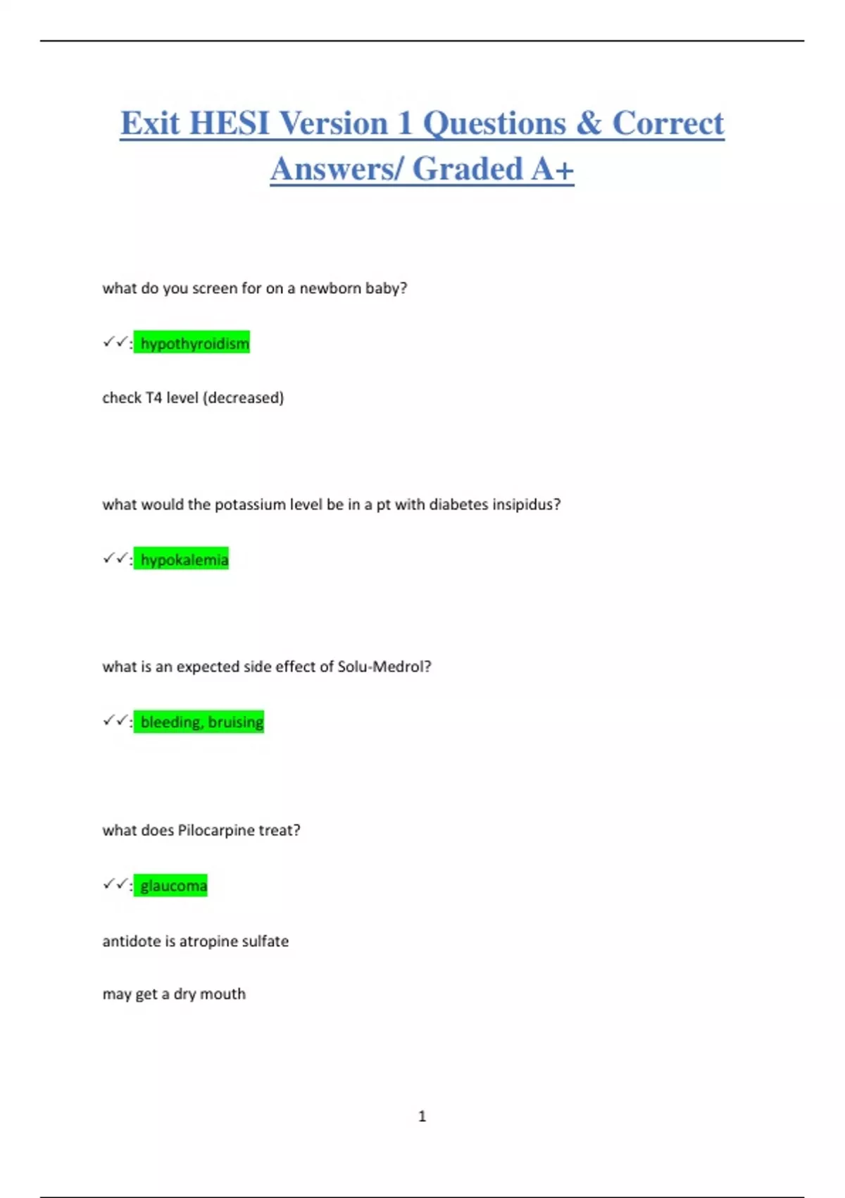 Exit HESI Version 1 Questions & Correct Answers/ Graded A+