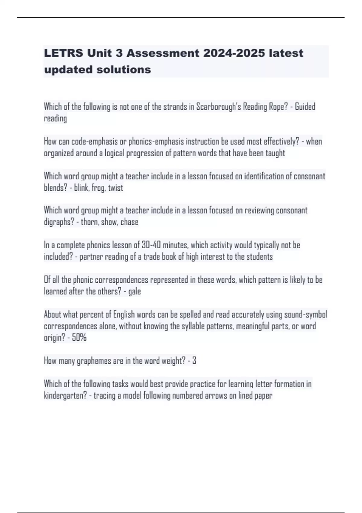 LETRS Unit 3 Assessment latest updated solutions Which of the following is not one of the strands in Scarborough's Reading Rope? - Guided reading How can code-emphasis or phonics-emphasis instruction be used most effectively? - when organized around a logical progression of pattern words that have been taught Which word group might a teacher include in a lesson focused on identification of consonant blends? - blink, frog, twist Which word group might a teacher include in a lesson focused on reviewing consonant digraphs? - thorn, show, chase In a complete phonics lesson of 30-40 minutes, which activity would typically not be included? - partner reading of a trade book of high interest to the students Of all the phonic correspondences represented in these words, which pattern is likely to be learned after the others? - gale About what percent of English words can be spelled and read accurately using sound-symbol correspondences alone, without knowing the syllable patterns, meaningful parts, or word origin? - 50% How many graphemes are in the word weight? - 3 Which of the following tasks would best provide practice for learning letter formation in kindergarten? - tracing a model following numbered arrows on lined paper In Ehri's early alphabetic phase of word-reading development, students know some lettersound correspondences and most letter names. A student at this level is most likely to progress with instruction focused on: - blending and reading words such as at, an; mad,