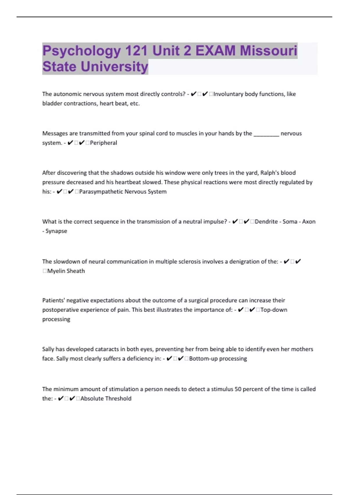 Psychology 121 Unit 2 EXAM Missouri State University 74 Review Questions Which Have Been Correctly Answered