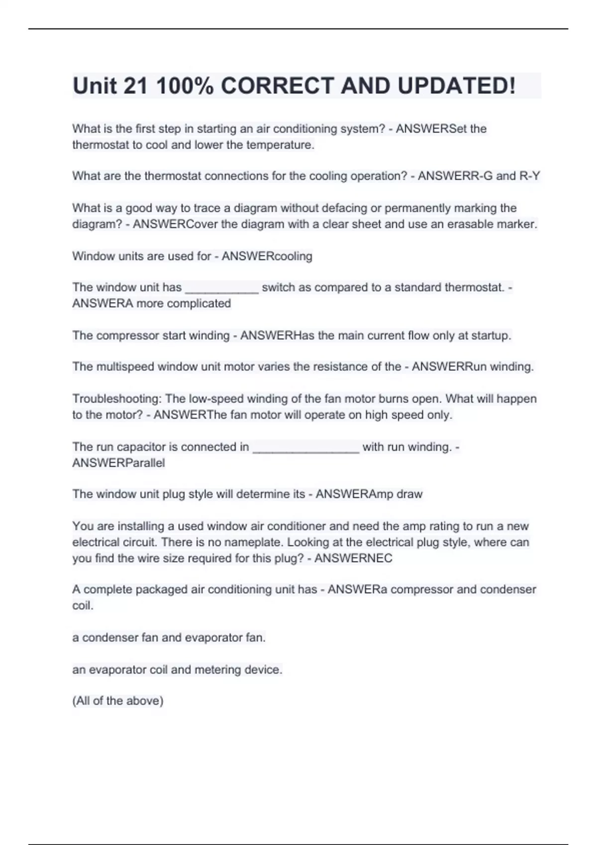 What is the first step in starting an air conditioning system? - ANSWERSet the thermostat to cool and lower the temperature. What are the thermostat connections for the cooling operation? - ANSWERR-G and R-Y What is a good way to trace a diagram without defacing or permanently marking the diagram? - ANSWERCover the diagram with a clear sheet and use an erasable marker. Window units are used for - ANSWERcooling The window unit has ___________ switch as compared to a standard thermostat. - ANSWERA more complicated The compressor start winding - ANSWERHas the main current flow only at startup. The multispeed window unit motor varies the resistance of the - ANSWERRun winding.