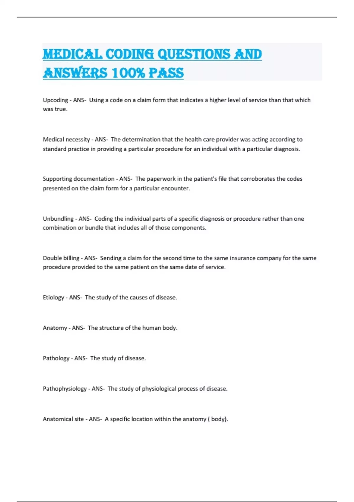 Medical coding Questions and Answers 100% pass Upcoding - ANS- Using a code on a claim form that indicates a higher level of service than that which was true. Medical necessity - ANS- The determination that the health care provider was acting according to standard practice in providing a particular procedure for an individual with a particular diagnosis. Supporting documentation - ANS- The paperwork in the patient's file that corroborates the codes presented on the claim form for a particular encounter. Unbundling - ANS- Coding the individual parts of a specific diagnosis or procedure rather than one combination or bundle that includes all of those components. Double billing - ANS- Sending a claim for the second time to the same insurance company for the same procedure provided to the same patient on the same date of service. Etiology - ANS- The study of the causes of disease. Anatomy - ANS- The structure of the human body. Pathology - ANS- The study of disease. Pathophysiology - ANS- The study of physiological process of disease. Anatomical site - ANS- A specific location within the anatomy ( body). Anatomical cavity - ANS- A space or area that is hollow and often houses organs and vessels. Anatomical direction - ANS- Medical terminology used to provide the location of a health problem or an approach for surgical procedure. Anatomical position - ANS- Medical terminology that describes the patient's position ( on the surgical or examination table). AHIMA - ANS- American Health Information Management Association Supine position - ANS- Patient is lying on his/ her back, face upward. Prone position - ANS- Patient is lying on his/her stomach, face downward. Sitting position - ANS- Patient is sitting up at a 90 degree angle to the table. Lithotomy position - ANS- Patient is lying on his/her back knees bent and apart, feet in stirrups. Dorsal recumbent position - ANS- Patient is lying on his/her back, knees bent, feet flat on table. Sim's (left lateral) position - ANS- Patient is lying on his/her stomach, right arm at side, right leg straight, left arm at right angle to head, left-leg knee bent upward toward waist. (Sim's right lateral would be reverse) Fowler's position - ANS- Patient is lying on his/her back with a headrest bringing the head and torso up at45 degree angle. Knee-elbow position - ANS- Patient is face down on the table , arms above head, buttocks in the air with knees at right angle. Proctologic position - ANS- Patient is lying face down with table assisting an upward presentation of rectum and anus. Condition - ANS- Health related situation. Eponym - ANS- Condition named after a person. Manifestation - ANS- Condition caused or developed from the existence of another condition. Co-morbidity - ANS- Separate condition/illness present in the same patient at the same time as another, unrelated condition or illness. External cause - ANS- An event, outside the body, that causes injury, poisoning, or an adverse reaction. Adverse effect - ANS- An unexpected, bad results; also known as an adverse reaction. Sequela (late effect) - ANS- Cause-and-effect relationship between an original condition, illness, or injury and an additional problem caused by the existence of that original condition. Underlying condition - ANS- One disease that affects or encourages another condition. Not elsewhere classified (NEC) - ANS- Specifics that are not described in any other code in the ICD-10-CM book;also known as not elsewhere classified.